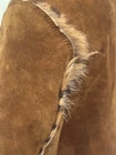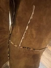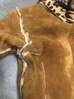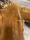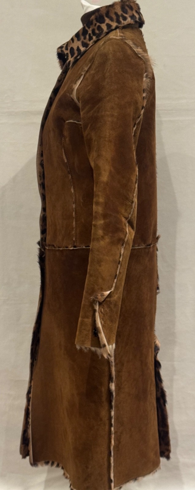 Dolce & Gabbana Y2K reversible coat in chestnut brown suede on one side and pony hair fur-effect leopard cheetah print on the reverse. A true showstopper that captures Dolce & Gabbana’s sensual, structured elegance in one of this season’s most fashionable tones. The chestnut brown suede side features visible hand-finished edges trimmed with pony hair from the reverse, creating an intentionally raw, artisanal finish that adds designer glamour and luxurious chic. Minimalist snap buttons sit flush and function perfectly on both sides. The straight, slimming silhouette has long sleeves finished with three snap buttons at the cuffs, allowing the leopard pony hair to peek through. Good vintage condition with light, natural surface wear on the suede consistent with age and gentle use (light marks and discolouration but overall not obvious). The pony hair side shows slight ageing inside the arms and on some of the suede edging near the armpits, typical of this material, but not visible or obvious when worn. The suede is difficult to photograph and light reflections create extra uneven tones and shades on different images, though the colour is more even in person and a tad darker. Overall, the coat presents beautifully, maintaining its chic structure and luxurious feel. No size label as the coat is reversible; best fits IT 38/40 (refer to measurements). A rare Dolce & Gabbana collector’s piece: chic, feminine, and timelessly stylish. Approx. measurements: Chest: 43 cm (flat) Shoulders: 38.5 cm Sleeves: 61.9 cm Length: 100 cm Made in Italy.