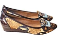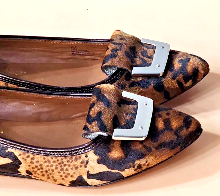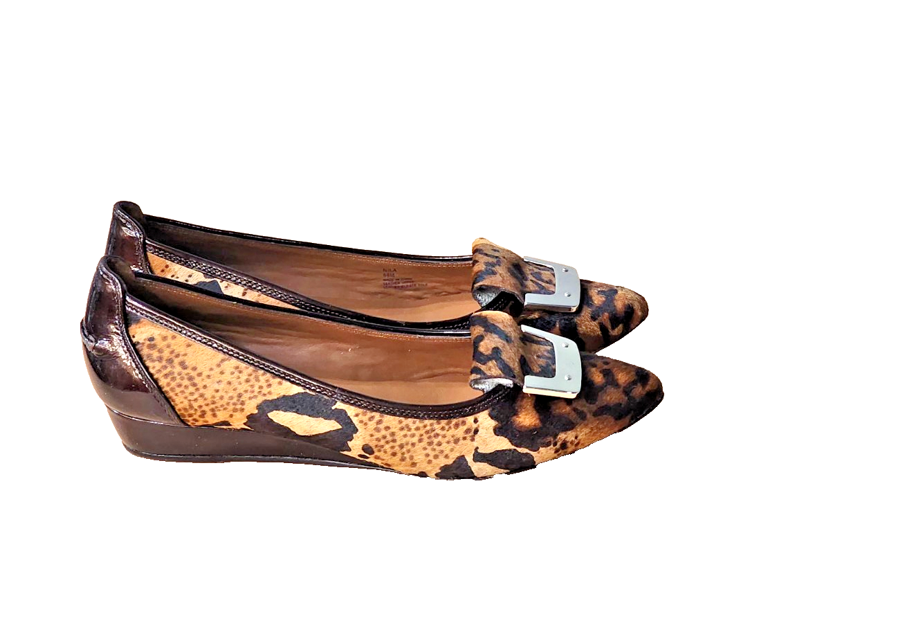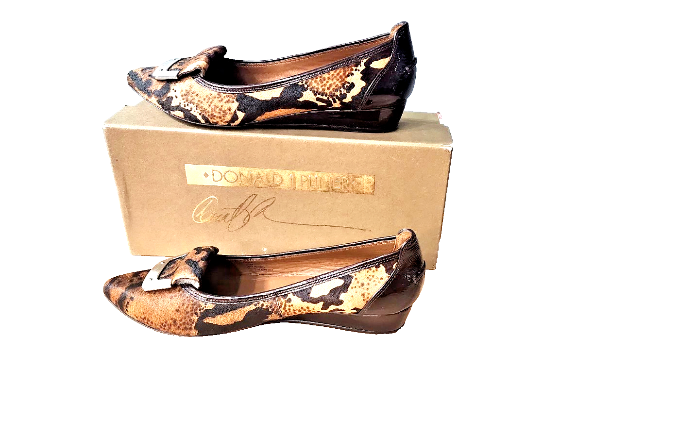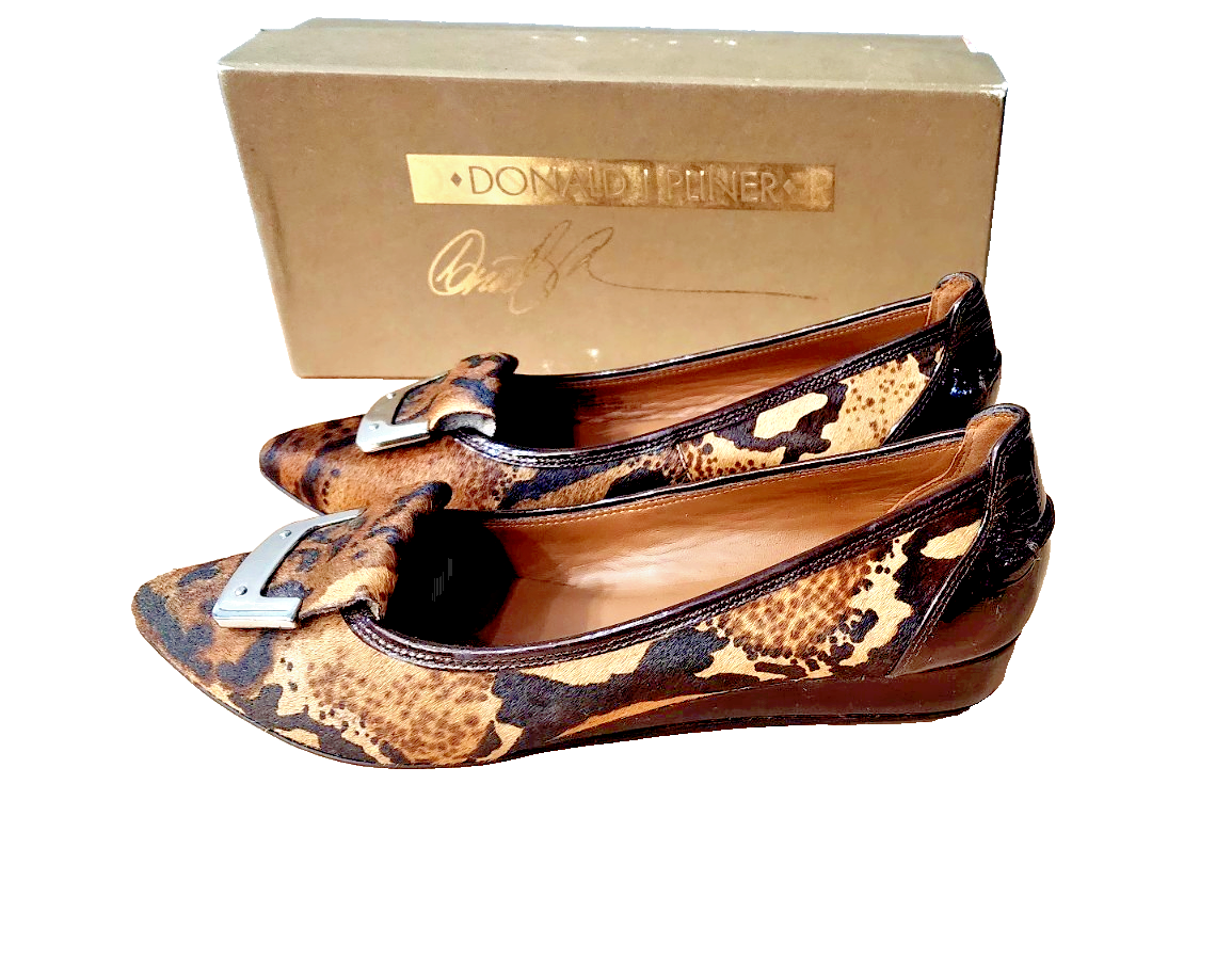 Elevate your fashion game with these Donald J Pliner wedge shoes featuring an animal print pattern. The shoes have a peep toe shape and slip-on closure for easy wear. The low wedge heel measures between 1-1.9 inches, providing a comfortable lift. Crafted from calf hair and patent leather, these shoes are perfect for any season. The slip-on style makes them ideal for a quick outing, while the animal print pattern adds a touch of personality to any outfit. These shoes are a must-have for any fashion-forward woman.