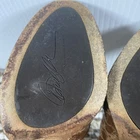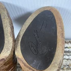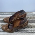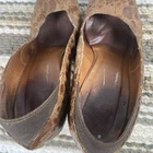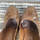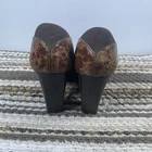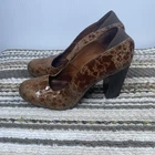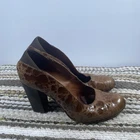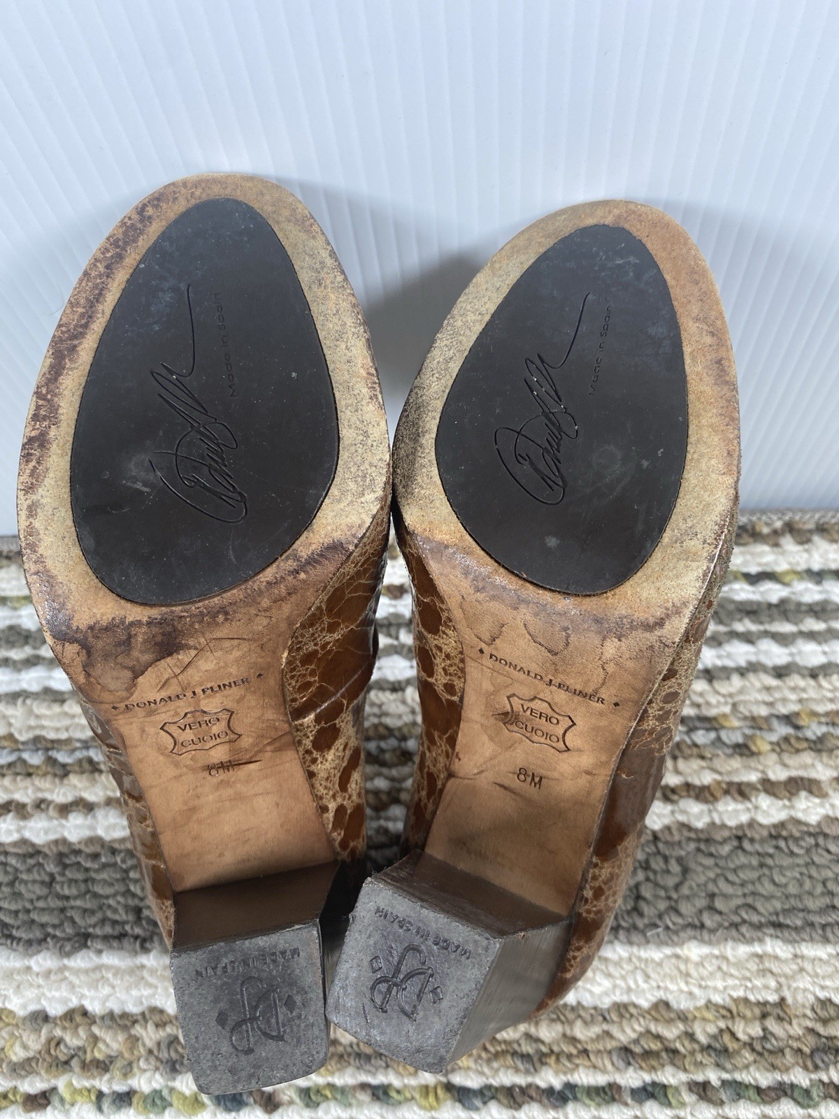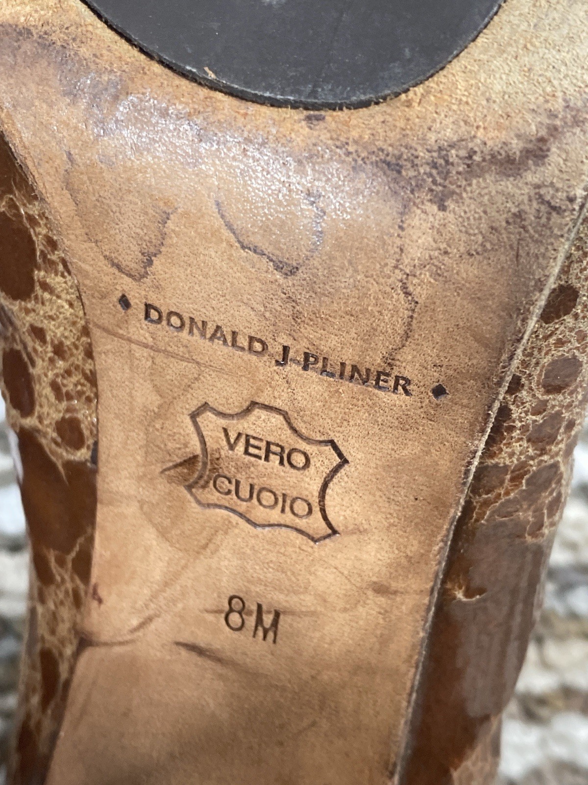 These stylish Donald J Pliner women’s heels feature a unique brown textured leather upper with a glossy finish. Made in Spain with Vero Cuoio genuine leather soles, they offer quality craftsmanship and a classic block heel design. Size 8M, slip-on style. Pre-owned with noticeable wear on upper coating and soles (see photos). Still plenty of life left! Heel height: approx. 4 in Color: Brown textured pattern Made in Spain Great brand — luxury comfort heels.
