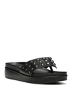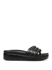 These stylish Donald Pliner wedge sandals are a steal for the price! The black snake leather looks chic and luxurious, while the 1.5-inch wedge gives just the right lift for all-day comfort. Though the left insole has minor damage (barely noticeable when worn), the quality leather upper and sturdy rubber sole make these a fantastic deal. Perfect for casual outings—super comfy slip-on design with a subtle studded detail that adds flair. Spot clean only, but worth it for such a sleek look!
