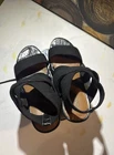 Step into elegance with these Donald J. Pliner black wedge sandals, featuring a sophisticated layered strap design. The medium-height wedge heel boasts a textured finish, offering both style and comfort for any occasion. Perfect for adding a touch of class to your ensemble. The left inside shoe has a slight flaw with the stitching on the heel see photo but overall these are in great condition with no signs of wear. Jute elasticized upper straps. Memory foam sock lining. Leather insole. Slip-on style. Open, round toe design. Raffia covered wedge heels and platform. Rubber outsole. Heel Height: 3 in Weight: 12 oz Platform Height: 1⁄2 in