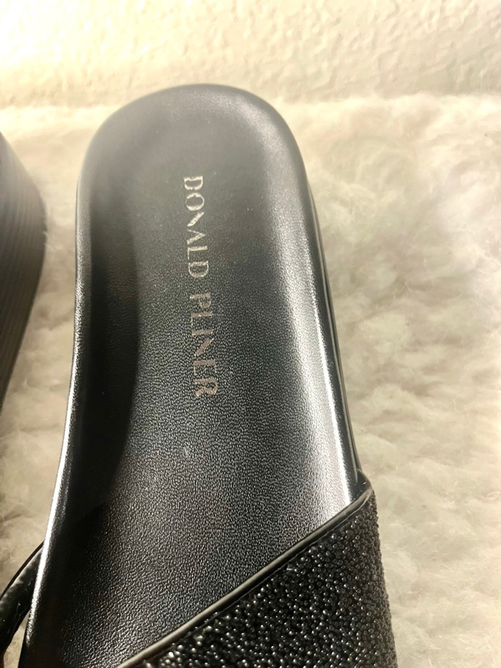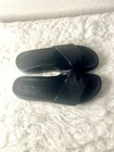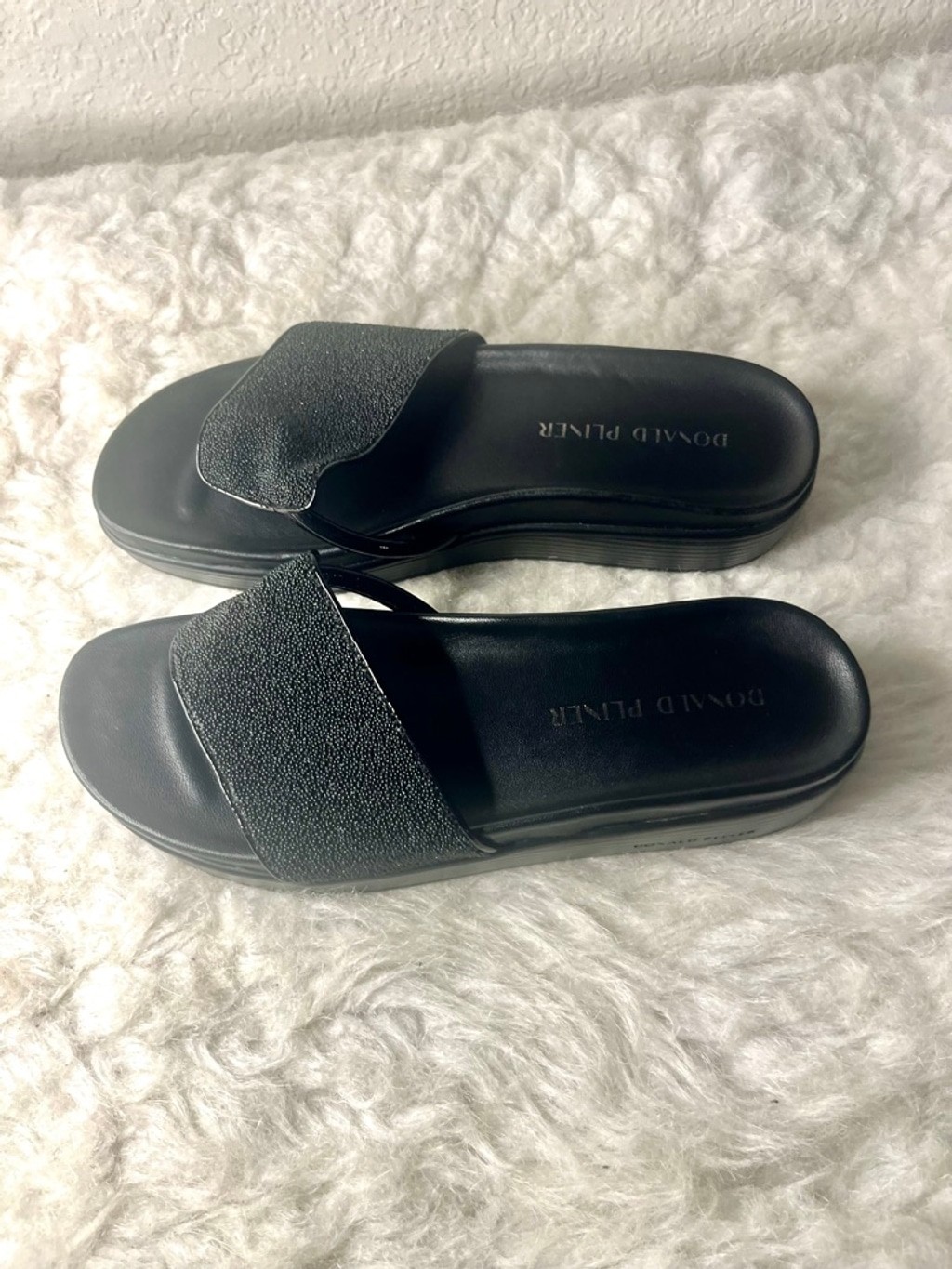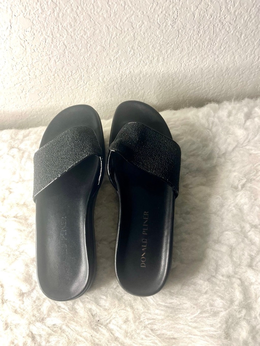 Donald Pliner FiFi Slide Black Shimmer Sandals Women Size 7.5M Pre-owned, good condition This one has a toe thong . The leather is a soft suede with a shimmer. These are super comfortable . The FIFI is our best-selling slide sandal is made with a comfortable molded footbed. A rubber unit bottom and thin toe-post provides added support, while a classic round toe completes the style. Molded footbed Rubber unit sole