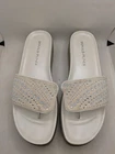 The product is a stylish pair of Donald Pliner sandals for women in size 9, featuring a slip-on style in white with blue and metal stud accents. The sandals have a flat heel, making them perfect for casual occasions during the summer and spring seasons. The fabric and synthetic upper material, along with the studded and rhinestone accents, add a trendy touch to the overall design. Made by the reputable brand Donald Pliner, these sandals are a fashionable choice for women looking to make a statement with their footwear.