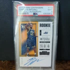 This Donovan Mitchell 2017 Contenders Rookie Ticket Vertical Auto. #/125 PSA 9 is a must-have for any basketball trading card collector. The card features an autographed version of the vertical rookie ticket, with serial number, short print, and parallel/variety features. It has been professionally graded by the Professional Sports Authenticator (PSA) and comes with a grade of 9. The card is part of the 2017 Panini Contenders set, featuring the Cleveland Cavaliers and Utah Jazz teams. It is a rare find, with only 125 cards produced, and is sure to be a valuable addition to any collection. Whether you are a fan of Donovan Mitchell or are simply collecting sports cards, this item is not to be missed.