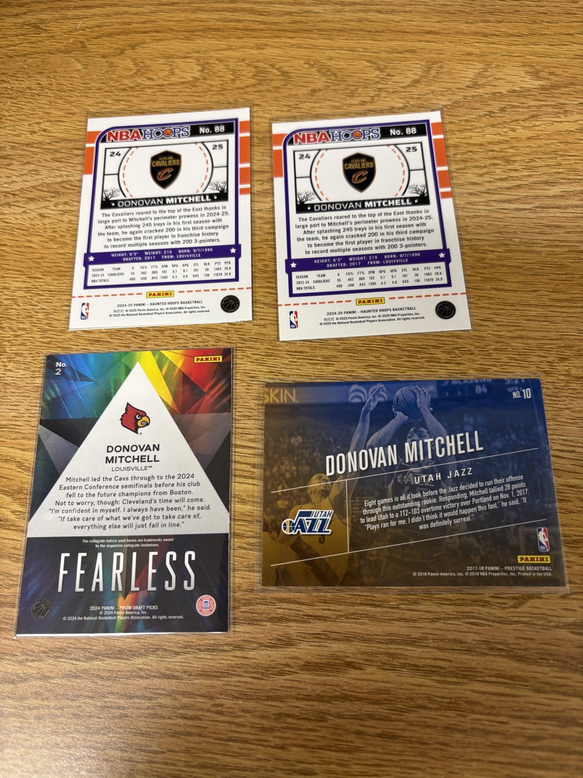The product is a lot of 4 sports trading cards featuring basketball player Donovan Mitchell, specifically from the Cleveland Cavaliers team. These cards are manufactured by Panini and include features such as rookie cards, parallels, and inserts. This collection offers fans and collectors a variety of cards showcasing different aspects of Mitchell's career in the NBA, making it a desirable addition to any basketball card collection.