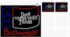 "D on't Mess with Texas" Budweiser---- NEON Sign Dimensions: approx 10" x 16" x 2" Product Features: Striking neon-style design with "Don't Mess with Texas" text over iconic Budweiser logo Equipped with adjustable dimmer control for customizable brightness (10%-100% range) Inline power switch provides easy access to on/off and dimming functions Flexible silicone LED tubing creates a vibrant, authentic neon-like glow Clear acrylic backing provides sturdy support and clean appearance Pre-drilled mounting holes with included hanging chain Lightweight construction (under 2 pounds) Technical Specifications: Power Source: Standard USB connection Operating Voltage: 5V DC (safe, low-voltage operation) Construction: Durable silicone LED strips on acrylic backing Lighting: Bright, energy-efficient LED technology Temperature: Cool-running design Easy plug-and-play installation Package Includes: LED Neon-Style Sign (12" x 18" x 2") USB Power Cord with Dimming Controller Mounting Chain Set Basic mounting hardware Key Benefits: Safe Operation: No glass, low voltage, minimal heat Energy Efficient: Low power consumption Durable Design: Impact-resistant materials Simple Setup: Just plug into any USB port Adjustable Light Output: Control brightness to suit your space Silent Operation: No buzzing or noise Basic Care: Dust with soft, dry cloth as needed Keep USB connection secure Avoid exposure to excessive moisture Sold as-is, all functions working including adjustabl e dimmer