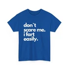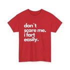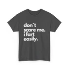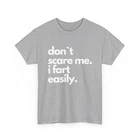 Funny shirts are one of the best present you can give someone. Surprise someone with this great tee. Or maybe present yourself, who knows. funny & sarcastic Don`t Scare Me I Fart Easily shirt 100% premium cotton for comfort Crafted from soft, high-quality cotton, this T-shirt offers exceptional comfort, perfect for everyday wear or lounging. High-quality print for lasting design Our printing process ensures vibrant, long-lasting designs that stay fresh even after multiple washes. Tear-away label for comfort Designed with a tear-away label, this shirt offers a tag-free experience, preventing irritation on the skin. Ethically sourced materials We are committed to ethical sourcing, ensuring that all materials used in this product meet strict labor and environmental standards.