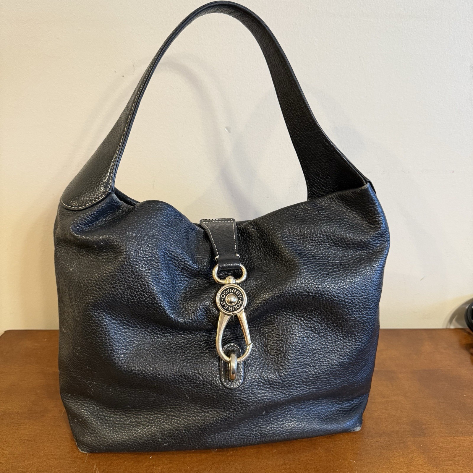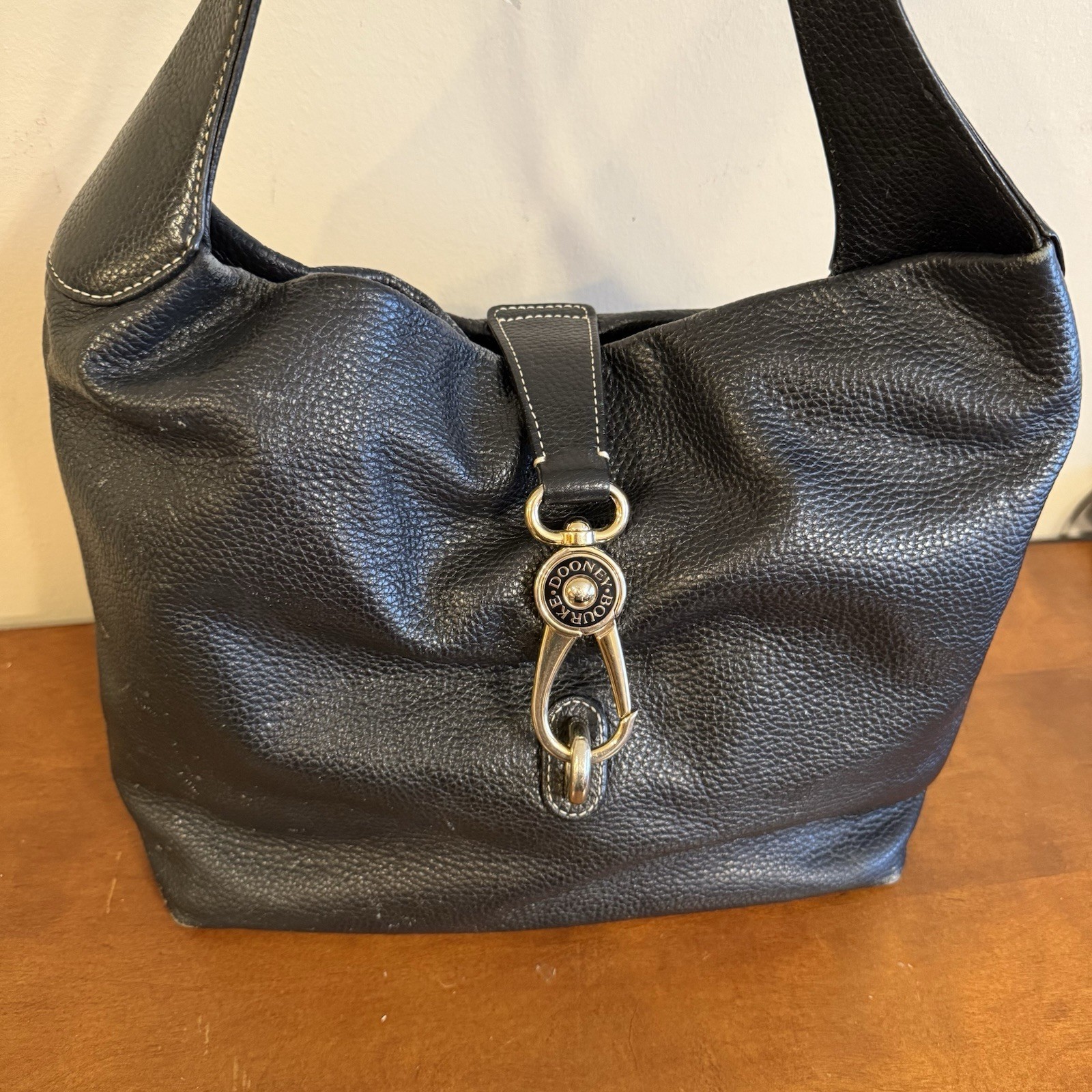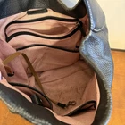 This is an absolutely beautiful bag, however, it was not well taken care of. You can see it's been worn in a couple places, especially at the bottom. And the most significant damage on this I think is in the liner where somebody left what looks like a dozen pens open, so there's ink all down at the bottom of the pink liner. It may come out with some TLC.