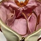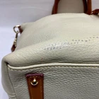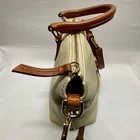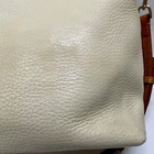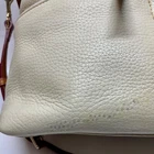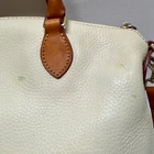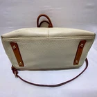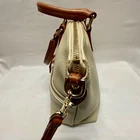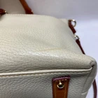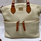 Dooney & Bourke Dillen Double Pocket Convertible Satchel Cream Pebbled Leather This bag is in good pre-owned condition with minimal signs of use. Please see all photos as this is the exact bag you will receive. There are some marks in the leather as shown in the photos above, may come off with a good polishing treatment. This Large handbag has a zip top closure with double handles. Inside liner is clean and features an additional zip pocket and 3 multifunctional slip pockets. There is also 2 front zippered pockets and the optional adjustable crossbody strap. Measurements of the bag are; 13"w, 10"h and 5" deep with a 5" handle drop. Thanks for looking!
