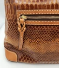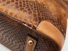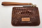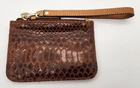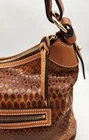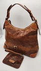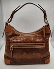 Dooney & Bourke Erica Brown Snakeskin Embossed Leather Hobo Shoulder Bag Wallet Very good condition. Purse and coin purse/wallet is previously used with wear to exterior leather and hardware. The purse has a spot on leather corner (image #17), white paint transfer to base edge (image #18), and spot on leather (image #11). See images for condition. Coin Purse/Wallet: 6 inches wide, 4.25 inches high. Purse: 14 inches wide, 10 inches high, 6 inches deep. Measurements are approximate.