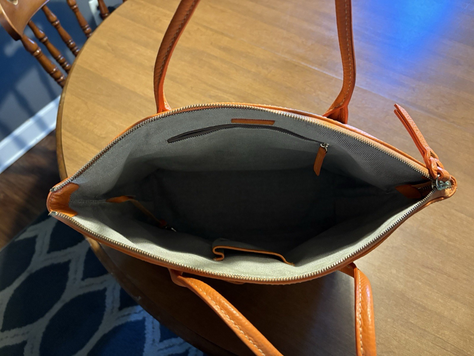 The Dooney Bourke Large Leather Handbag is a stylish satchel/top handle bag with a rectangular shape and a pebbled finish. It features a zip closure, brown leather handles/straps, gold hardware accents, and inner pockets for organization. The exterior is made of orange leather with a fabric lining, making it a durable and practical accessory for women who appreciate designer bags. This handbag from the Dooney & Bourke Pebble Grain collection is a timeless piece that combines classic style with modern functionality.