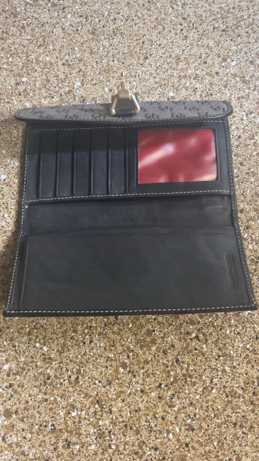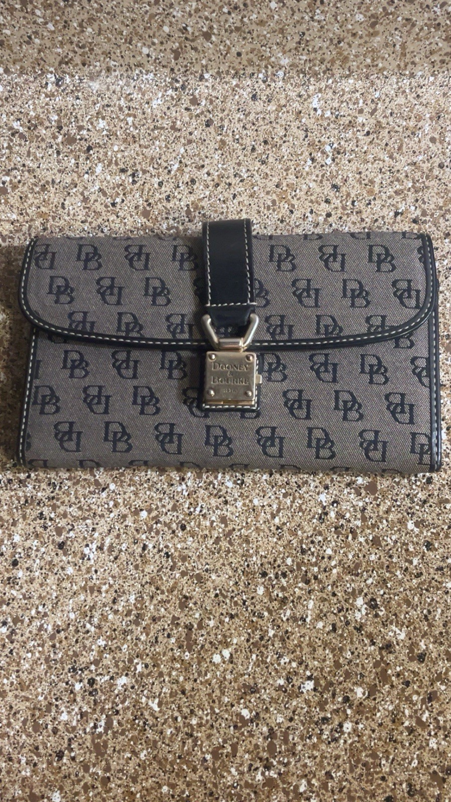 The Dooney & Bourke Monogram Wallet with Clasp in gray is a stylish and classic accessory for women. Made from a durable blend of polyester, leather, and cotton, this wallet features a monogram pattern with the signature logo accent. With a convenient clasp closure, multiple credit card slots, and a spacious billfold, this wallet is both functional and fashionable. Perfect for collectors or those who appreciate vintage-inspired accessories, this wallet exudes a timeless charm with a touch of 80s and 90s flair.