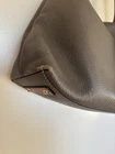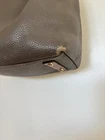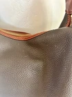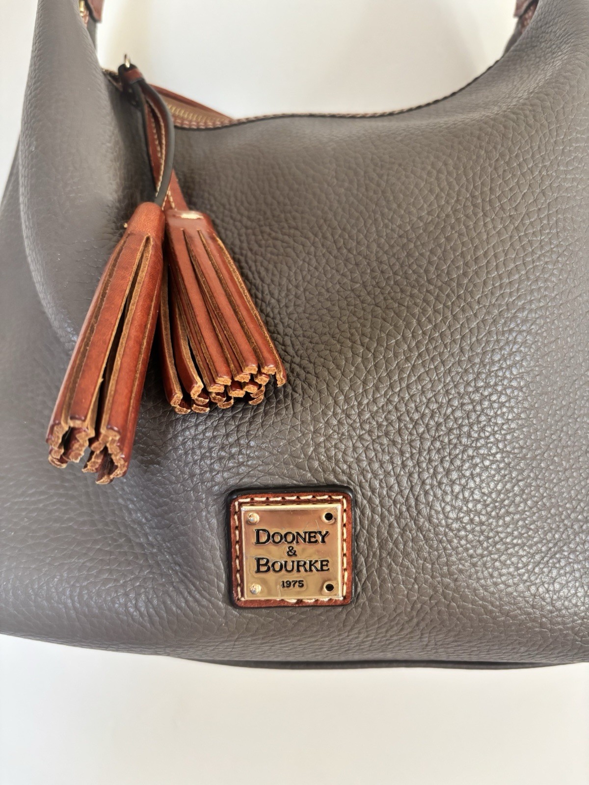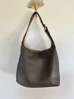 Classic, structured, and beautifully made β this Dooney & Bourke pebbled leather hobo bag features rich taupe genuine leather with contrast saddle-brown trim and oversized tassels. The iconic red interior and Dooney leather patch confirm authenticity. This style is loved for its slouchy-yet-polished shape, roomy interior, and durable pebbled leather that wears beautifully over time. πΏ Details β’ Brand: Dooney & Bourke β’ Style: Pebbled Leather Hobo / Shoulder Bag β’ Color: Taupe with brown trim β’ Interior: Red fabric lining with leather-trimmed pockets β’ Features: β’ Oversized leather tassel zipper pull β’ Brass hardware β’ Feet on the bottom β’ Zip top closure β’ Pebbled genuine leather β’ Adjustable shoulder strap β’ Size: Approx. 12β H Γ 14β W Γ 6β D (visually estimated) β¨ Condition: Overall very good used condition, with visible wear on the bottom corners (see photos). Interior is clean. Leather is soft and high quality. Priced accordingly.