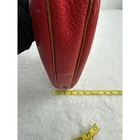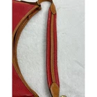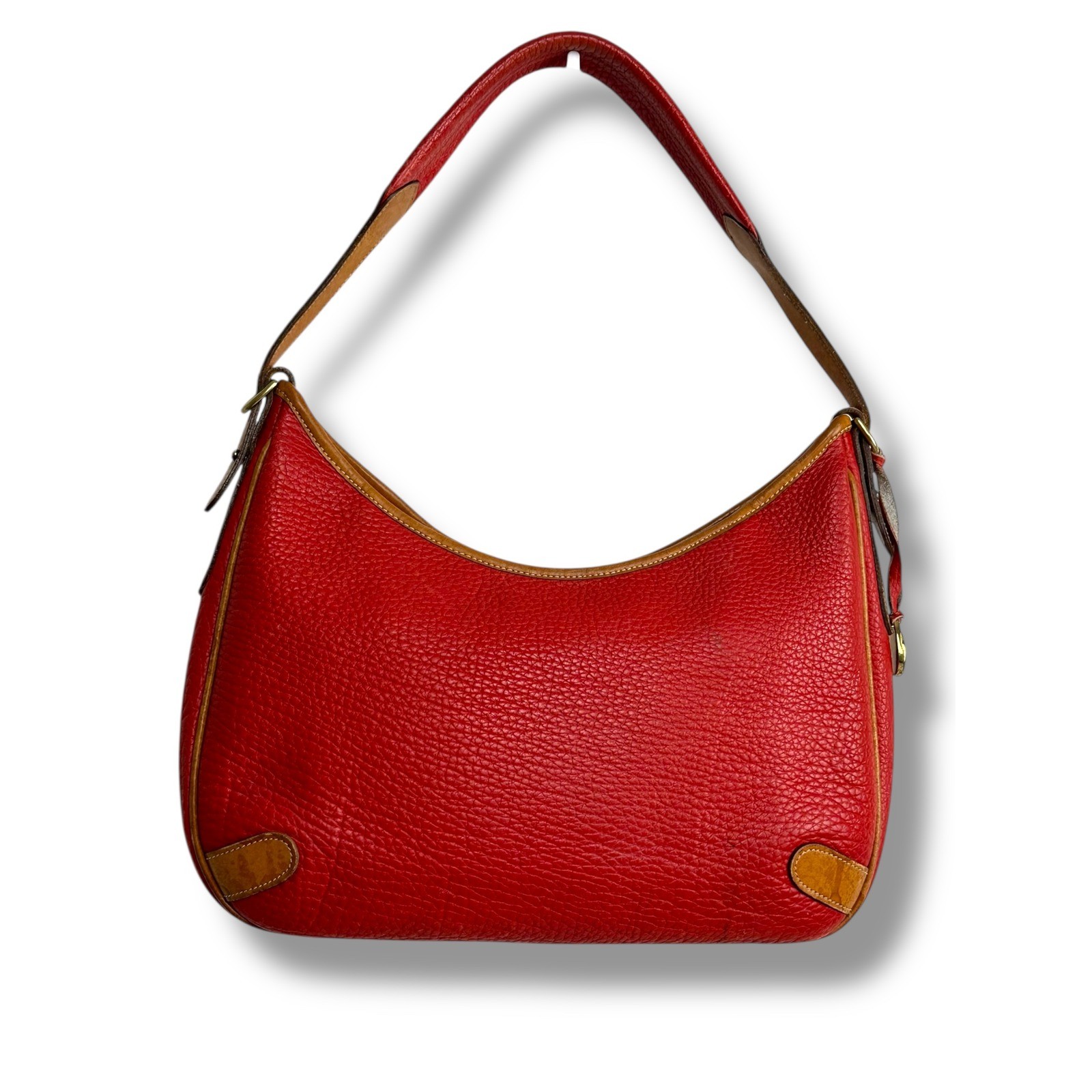 A classic Dooney & Bourke red pebble leather hobo bag. This iconic all-weather leather piece showcases a rich red hue complemented by tan leather trim and stitching. The curved silhouette is accentuated by reinforced tan leather corners. A braided leather fob with a brass Dooney & Bourke charm dangles from the strap. The interior features a zippered pocket and slip pockets for organization. Perfectly suited for everyday errands, weekend outings, or adding a pop of color to a casual ensemble. See photos for wear on corners, handle & slight stain on one side. See photos for approximate measurements Exterior Material: Leather Style: Hobo Bag Exterior Color: Bright Red Department: Women Lining Color: Red Handle/Strap Material: Leather Handle/Strap Color: Brown Lining Material: Fabric Hardware Color: Gold Closure: Zip Bag Height: 12 in Bag Depth: 4 in Accents: Stitching, Zipper Features: Inner Pockets, Lined Keywords: Dooney Bourke, hobo, leather, red, classic, designer, structured, everyday, chic, authentic, vintage inspired Check photos for item measurements. Items shipped from a pet friendly, smoke-free home