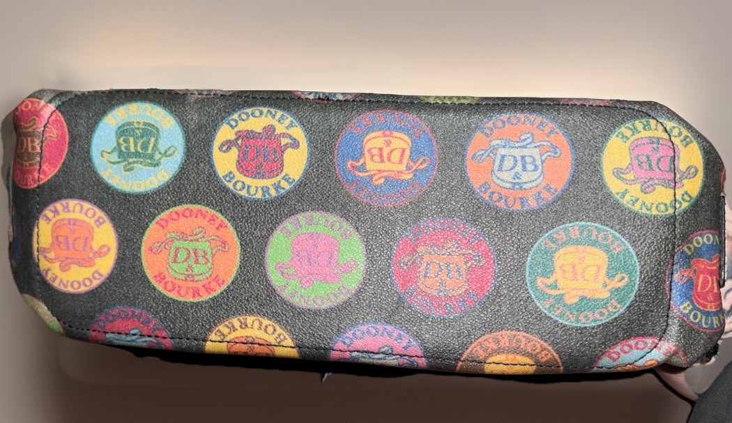 Carry your essentials with playful charm in this vibrant Dooney & Bourke satchel. The iconic logo pattern pops with a kaleidoscope of colors against a sophisticated dark background, making a delightful statement. Gleaming gold-tone hardware and a sweet heart-shaped logo charm add a touch of polished flair, while the structured silhouette and comfortable top handles ensure both style and practicality. Exterior Material: Leather Style: Satchel/Top Handle Bag Exterior Color: Multicolor Department: Women Product Line: Burberry Doodle Lining Color: Multicolor Handle/Strap Material: Leather Handle/Strap Color: Black Lining Material: Fabric Hardware Color: Gold Pattern: Logo Closure: Drawstring Accessories: Bag Charm Keywords: Dooney Bourke, logo print, multicolor, designer, satchel handbag, top handle, leather trim, playful, colorful, statement bag, everyday bag