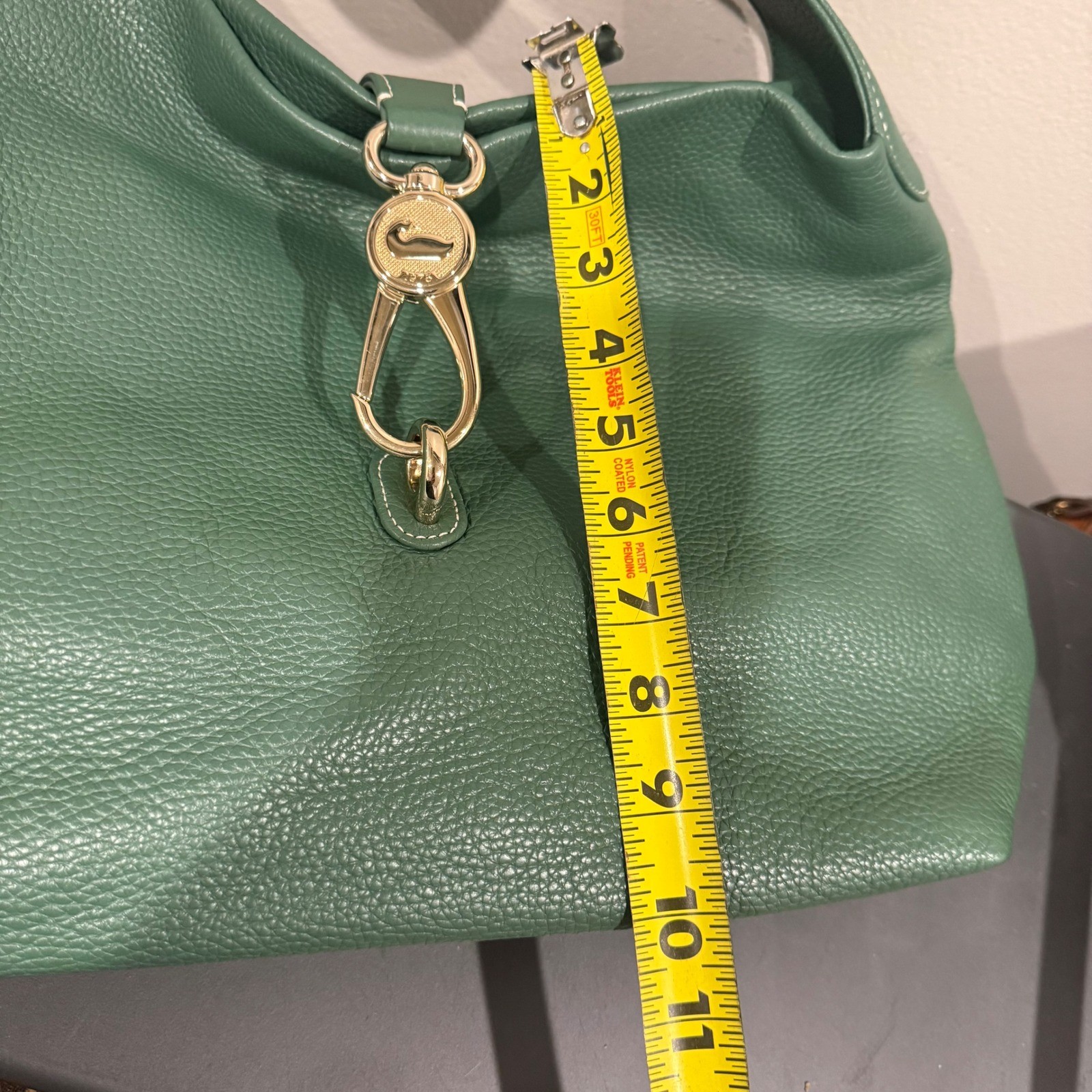 Discover effortless sophistication with this stunning Dooney Bourke shoulder bag. The rich green pebbled leather offers a luxurious texture that feels wonderful to the touch, while the elegant gold-tone clasp adds a touch of polished glamour. This versatile satchel is designed to carry your essentials with ease, making it the perfect companion for a weekend brunch or a stylish evening out. Measurements: • Width: 14 in • Height: 10 in Exterior Material: Leather Style: Hobo Bag Exterior Color: Green Department: Women Lining Color: Pink Handle/Strap Material: Leather Handle/Strap Color: Green Lining Material: Fabric Hardware Color: Gold Closure: Clasp Bag Width: 15 in Bag Height: 10 in Bag Depth: 6 in Keywords: pebbled leather, gold hardware, designer handbag, crossbody, tote, everyday bag, classic, structured, premium leather, chic, sophisticated, work bag