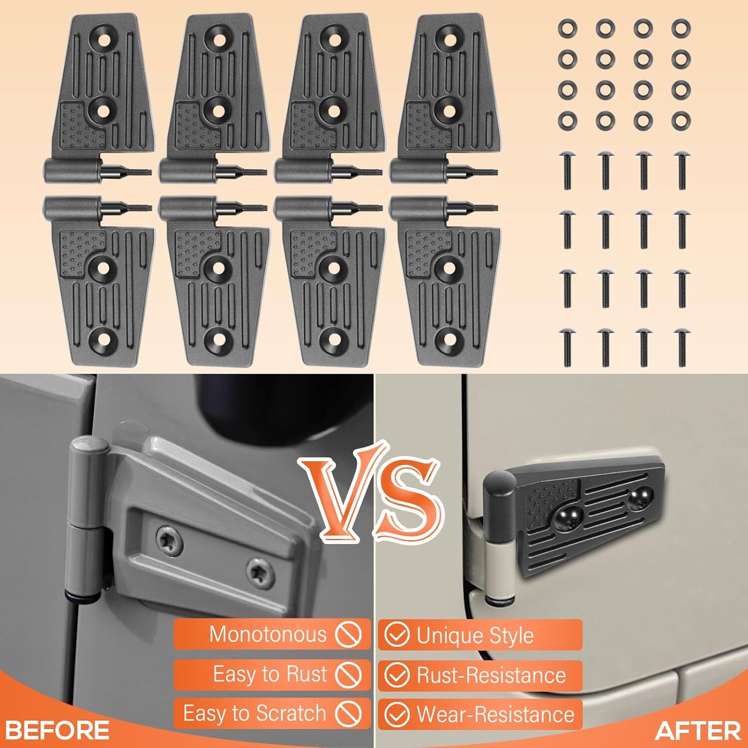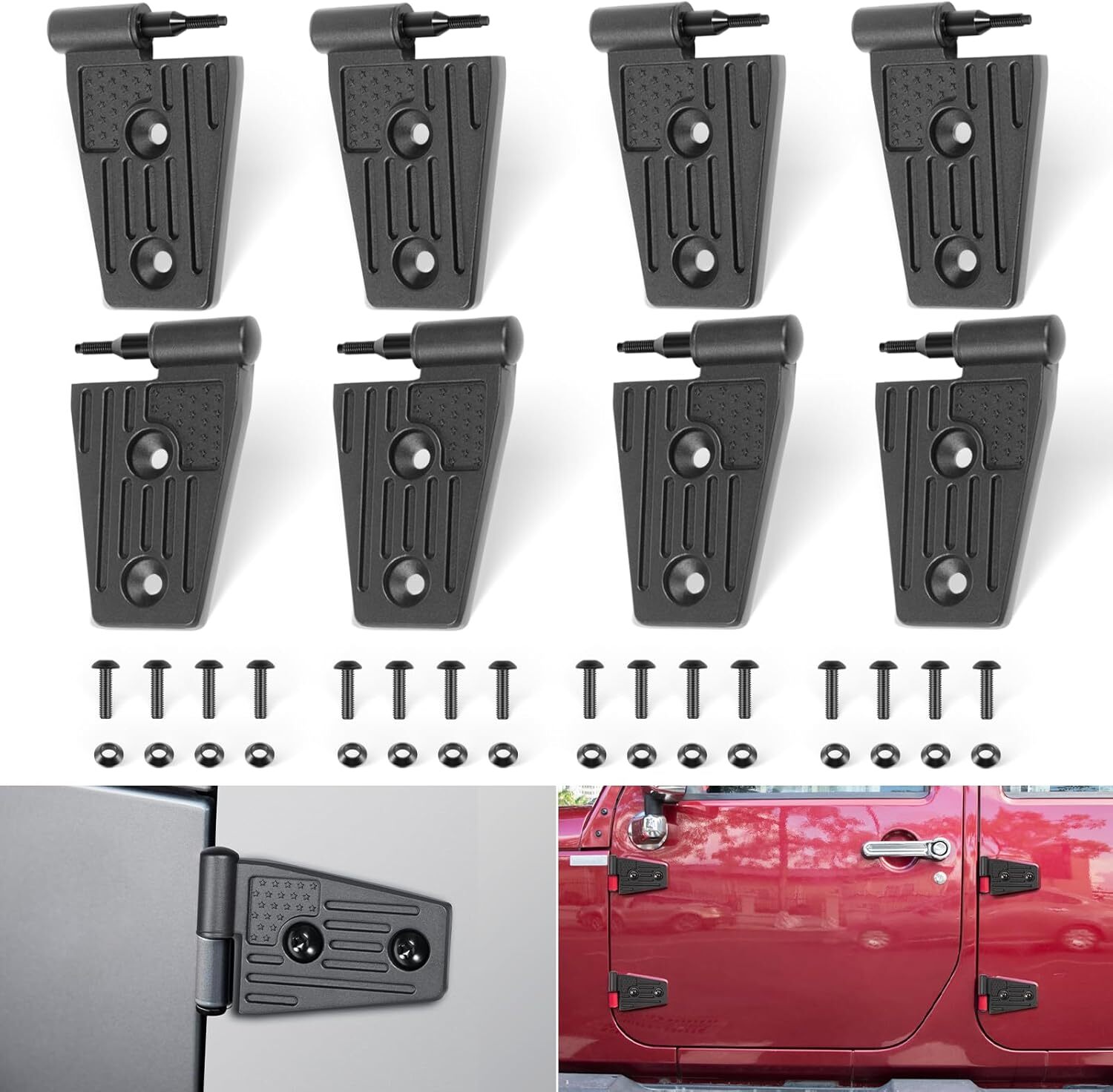 Door Hinge Kit for Jeep Wrangler JK JKU Sport Rubicon Sahara X Unlimited 2007-18 Door Hinge Kit Exterior Accessories Fits for Jeep Wrangler JK JKU Sport Rubicon Sahara X Unlimited 2007-2018 (Aluminum Alloy 8PCS) Strong Compatibility: Fits for Jeep Wrangler JK JKU Sport Rubicon Sahara X Unlimited 2-Door and 4-Door 2007-2018. (NOT FIT FOR JL) Ultimate Protection: USA flag design provides a high-class and fashion style for your car, changes the ordinary exterior design of the car and adds unique colors, it can cover existing scratches and prevent your car from fingernails, key scratches, etc. Includes protective pads on the back to prevent any damage to the original hinge area. Easy Installation: No drilling or modifications required, no damage to your car, no impact on door function, and doors close smoothly after installation. Directly remove the original door hinge, install new door hinge and screw in the provided washers and bolts to secure the door hinges. Superior Material: Made from premium aluminum alloy and finished with black powder-coated for wear-resistant, corrosion-resistant and rust-resistant. Hardened construction offers high strength and impact resistance, and will not break or crack easily during use. Off-Road Ready: Built to withstand harsh weather conditions, mud, and rough terrains while adding a unique touch to your ride, making it ideal for off-road enthusiasts. Payment Delivery details Terms of sales Returns Contact us Payment 1. All major credit cards are accepted through our secure payment processor Payoneer. 2. Please make sure your Shipping address is correct before you pay, cause it cannot be changed once the order shipped out. Delivery details 1. We only ship to confirmed ebay addresses. Your ebay address MUST MATCH your Shipping address. 2. Please read the shipment and payment detail carefully before you bid. Terms of sales ★If there are any problems with our products, Please feel free to contact us. We will always here to solve them for you. We should try our best to make a happy easy transaction. ★If you are satisfied with our products and our service, please tell your friend and leave us positive feedback. If you are not satisfied with our products or service, please DO tell us. Returns 100% Satisfaction Guarantee: Your satisfaction is our priority. We strive to give our customers excellent service.All our products support 60-Day money-back guarantee, 12-Month warranty for quality-related issues. Simply return it for your warranty. Contact us Any Questions,Just feel free to contact us on eBay.We will reply you in 1-2 business day.