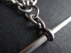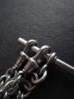 William thorneywork birmingham 1881 sterling silver double albert pocket watch with lions on the links some slightly rubbed .1911 silver sixpence fob. Sterling silver links . Solid silver (tested) clips matching in style on marked SS for sterling silver the other Real Silver. Good condition springy clips .weight 29g . t bar 1.5 inches. chain 17.5 inches long. 5mm wide.