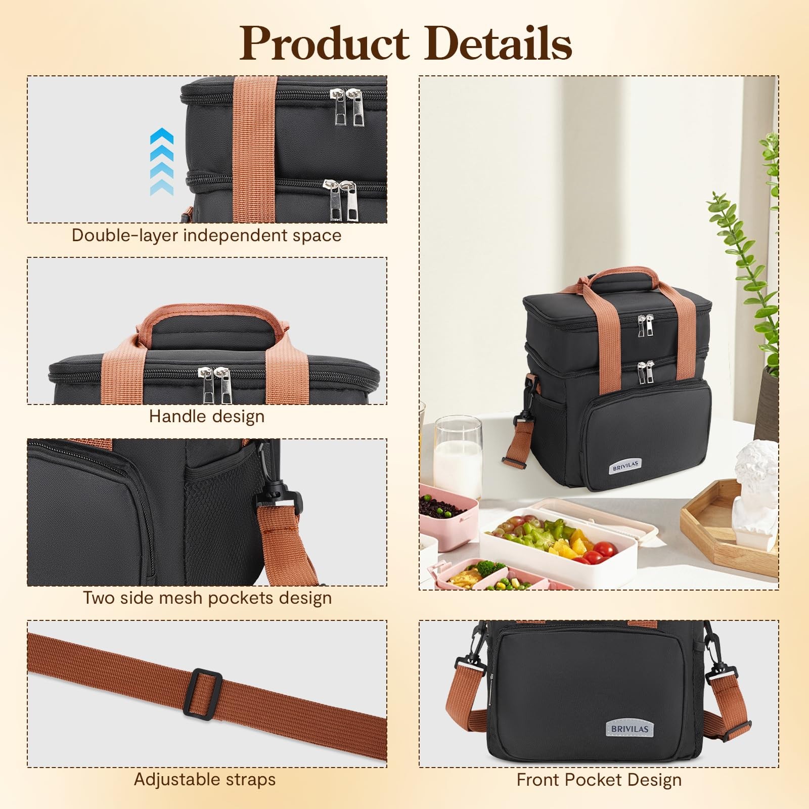Product Name: Double Layer Heightened Crossbody Lunch Bag Product Shape With its sleek, layered cube design and smooth lines, this lunch bag blends beauty with practicality for your everyday carry needs Dimensions Measuring 25cmx 18cmx 27.5cm, this bag offers the perfect amount of space to hold your daily lunch essentials without being bulky and easy to carry around INTERIOR MATERIALS: The lining is made of high-quality snowflake-patterned aluminum foil and PEVA material. This combination not only insulates and keeps food fresh, but also ensures that your lunch tastes as good as when it was first made. Plus, it's easy to clean Exterior Fabric: The exterior is made of a stylish and durable cationic fabric mixed with a soft and comfortable non-woven fabric. The cationic fabric has excellent gloss and abrasion resistance, giving the bag a stylish appearance and durability. The non-woven fabric enhances the softness and breathability of the bag, ensuring a comfortable feel LARGE CAPACITY: The specially designed double-layer elevated structure provides amazing storage space, which can easily accommodate multi-layer bento boxes, fruits, beverages and cutlery to meet your diversified lunch combination needs Insulation: Aluminum foil and PEVA lining inside form an effective insulation layer to keep food warm and fresh for a long time even outdoors, enhancing your lunch experience STYLISH CROSSBODY DESIGN: Equipped with an adjustable shoulder strap, it supports crossbody, freeing your hands during busy commute or outdoor picnic DURABLE AND EASY TO CLEAN: The combination of cationic fabric and non-woven fabric is not only beautiful and durable, but also easy to take care of, stains can be easily wiped away, so the bag stays as good as new for a long time This double layered and heightened crossbody lunch bag is an indispensable companion in your daily life Now start enjoying the special dining pleasure ELEGANT DESIGN AND PRACTICAL: The double height crossbody lunch bag is stylishly designed and measures 9.8“ (L) x 7” (W) x 10.8” (H), which can hold your daily necessities without looking bulky. HIGH QUALITY INSULATION MATERIAL: Lined with high-quality aluminum foil and PEVA material, it is insulated to keep the food fresh and tasty, waterproof and leak-proof, easy to clean Durable and fashionable appearance: made of Oxford cloth, thickened cationic fabric is not only wrinkle-resistant, wear-resistant and washable, with good heat preservation, but also not easy to fade. SPACIOUS STORAGE SPACE: Double-layer construction provides ample storage space for multi-layer bento boxes, beverages and utensils. The insulated material keeps food warm and fresh for a long time, enhancing your lunch experience CONVENIENT SLANTED DESIGN: The lunch bag comes with an adjustable shoulder strap for easy slanting, freeing up your hands for busy commutes or outdoor picnics. This lunch bag is an indispensable companion in your daily life.