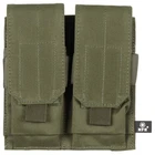 Double Magazine Pouch Army Military Ammo MOLLE Modular System Tactical Bag Green Universal double ammo pouch made of durable and abrasion-resistant polyester, accommodating four M4, M16 size magazines, as well as other size-matching items. Height-adjustable velcro-fastened flaps keep contents from falling out, while allowing quick and easy access when needed. Two PALS webbing with snaps sewn onto the back of the loader allow it to be attached in the MOLLE system to a belt, tactical vest, backpack or other pieces of equipment. adjustable lid flaps with hook-and-loop fastener central elastic loops 2 Molle fastening straps at the back with press button Dimensions magazine: ca. 8 x 17 x 5 cm (W x H x D) Dimensions total: ca. 16.5 x 17 x 6 cm (W x H x D) Technical specifications Material: 100% polyester Dimensions: 165 x 170 x 60 mm Weight: 225 g Manufacturer: MFH, Germany