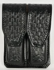 This double magazine pouch is designed specifically for Glock 19 pistols and can hold two 9mm magazines, may work with other magazines. The pouch is made of high-quality black basket weave leather and can be carried on the belt (OWB). It is perfect for duty use and is ideal for law enforcement professionals. It is easy to use and provides quick access to your magazines. The pouch is made of leather and is built to last. With this double magazine pouch, you can carry your magazines securely and comfortably.