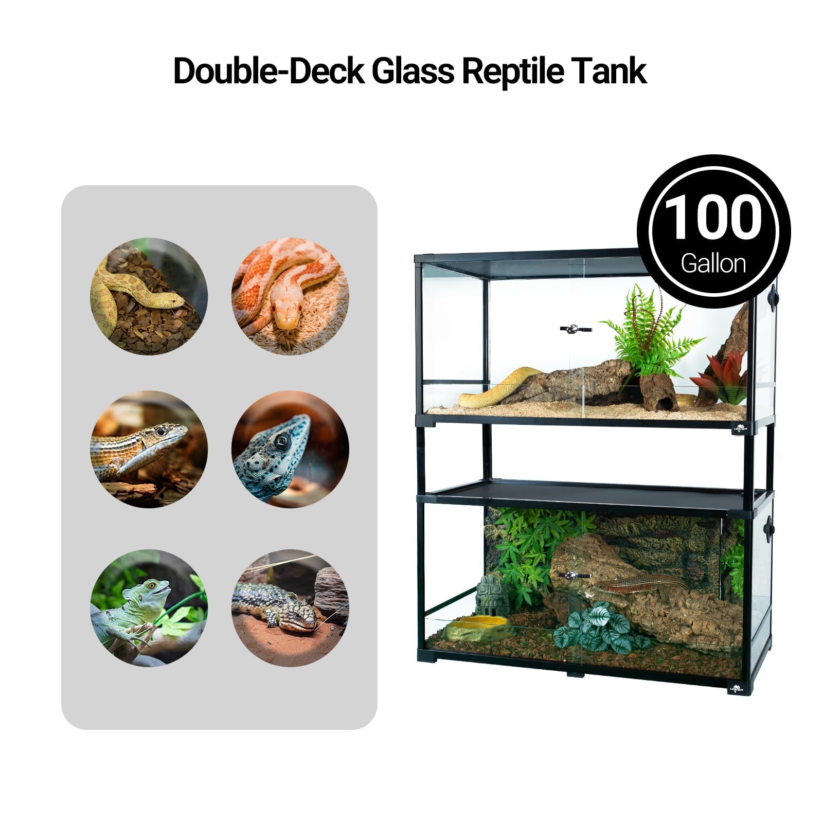 1*Double Stacked Reptile Tank 100 Gallon Unique & Practical Design: double-deck glass tank composed of 2pcs 50 gallon tanks, design for reptile enthusiasts who have multiple reptiles, suitable for bearded dragon, lizard, snake, gecko and other reptiles & amphibian. Top Screen Ventilation & Cable Pass: This reptile terrarium has used thin wire top screen which provides ventilation and allows uvb and infrared penetration, cable pass used rotating fixed structure whitch can holds lines firmly. Full View and Knock-down: reptile tank adopt high-quality tempered glass on all sides and equipped with glass lock, make the tank more sturdy and meet your all-round observation, also prevent reptiles from escaping, great choice for reptiles & amphibian. Support for Separate Use: This glass tank can be regarded as 68 gallon double-deck reptile habitat to save space, also can be divided into 2pcs 50 gallon tanks if you need, choose the appropriate way to give the reptile a beautiful home. Easy to Assemble and Clean: This reptile glass terrarium can be easy to install or disassemble with instructions, and the necessary tools for installation are included in the package, no need to worry about moving or cleaning the reptile tank.