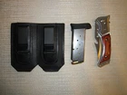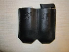 BRAIDS HOLSTERS DOUBLE MAGAZINE HOLSTER WITH DUAL CLIPS FITS 9MM & 40 CALIBER SINGLE STACK MAGS. ALSO FITS MOST POCKET KNIFES. CARRY A KNIFE AND A SPARE MAG IN THE SAME HOLSTER. INSIDE THE WAIST BAND OR OUTSIDE THE WAIST BAND FITS ALL SINGLE STACK 9MM & SINGLE STACK 40 CAL. MAGAZINES. MAG WILL FIT ALL THE WAY IN FOR SECURITY AND PROTECTION OF THE MAG. KEEPS PERFECT RETENTION ON MAG TO HOLD IT SNUG. BLACK 7 OUNCE HERMAN OAK TOP GRAIN LEATHER STRONG CLIPS EXACT MATCH TO ALL THE BLACK HOLSTERS I SELL. SAME LEATHER AND EAGLE STAMP PATTERN.