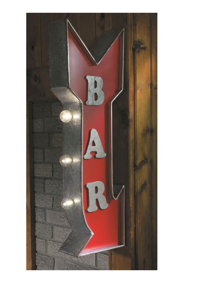 Bar Lighted Marquee Point the way to the bar with this marquee sign! The two-sided giant arrow sign sports BAR graphics, distressed steel, and three bright LED bulbs. It's powered by two AA batteries (not included) and measures 10 in. x 30 in. Great man gift for man cave , game room , or bar. Fast and Free Shipping!
