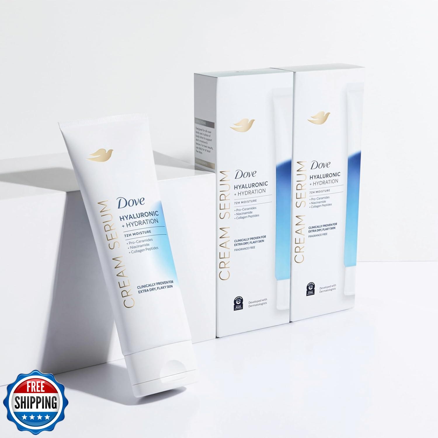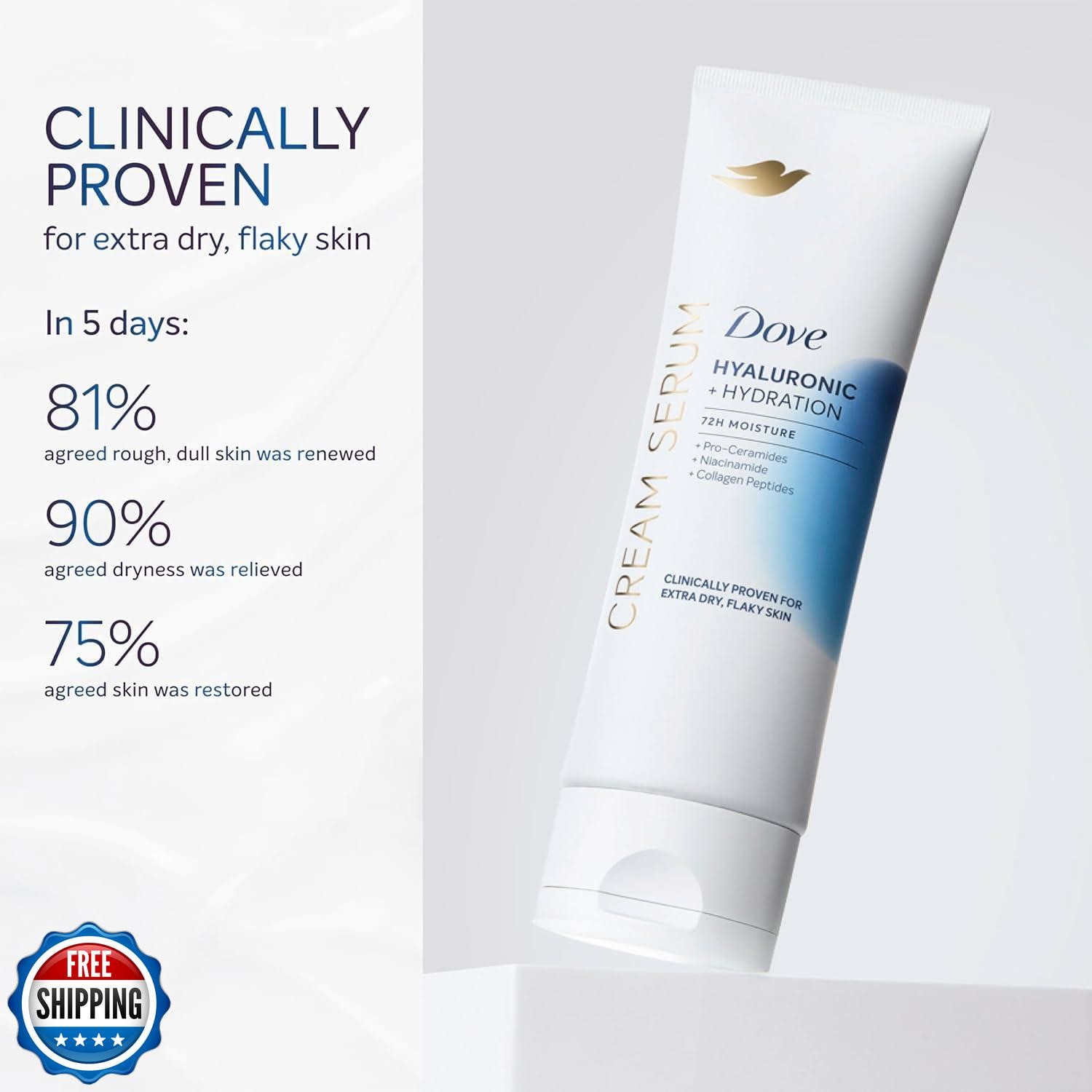 Dove Body Cream Serum Hyaluronic + Hydration for Extra Dry, Flaky Skin, with Pro-Ceramides, Niacinamide and Collagen Peptides Lotion, 8 oz Features NOT A REGULAR LOTION: Dove Cream Serums are developed with dermatologists and are formulated to go beyond moisturization to support skin's natural regenerative process for visible improvement in texture and tone. FORMULATED FOR VISIBLE RESULTS: From first use, skin is immediately smoothed and plumped with hydration. In five days, dry patches and flakiness are relieved, skin feels resilient and firmed, and texture is evened for visibly healthy, radiant skin. SCIENCE-BACKED: Dove Cream Serums are clinically tested for efficacy and safety for all skin types and tailored to include powerful ingredients scientifically evidenced to provide visible benefits to skin. FACE CARE FOR THE BODY: A high potency formula tested for real results and made with Hyaluronic Acid, Pro-Ceramides, Niacinamide, and Collagen Peptides. EXPERT CARE: Non-greasy, fast-absorbing, lightweight formula with a sheer application. Designed for all-over body use in place of body lotions and body moisturizers to support skin's hydration and texture. Shipping Free & Fast Shipping: We offer free shipping to most of the USA with a normal delivery time of 3-7 days. However, due to the current situation, additional delivery time (up to 3 weeks) may be required for some items. Alternative Carriers: We may use alternative carriers (e.g., USPS, FedEx, UPS) to ensure your package arrives safely and on time. Due to the use of multiple carriers, we are unable to provide a tracking number automatically. Handling Time: Orders are processed and shipped within 1-2 business days of receiving cleared payment. Shipping Restrictions: Shipping to Alaska, Hawaii, Puerto Rico, Guam, and other US territories may incur shipping charges or delivery restrictions. Please contact us before ordering, or your order can be refunded/cancelled. State Restrictions: Certain items may not be shipped to California due to state regulations. Contact for Tracking Updates: If you require tracking updates or have any concerns about the delivery of your order, please feel free to contact us, and we will be happy to assist you. Return Policy 30-Day Hassle-Free Returns: If you are not completely satisfied with your purchase, you can return the item for free within 30 days of receiving it for a full refund or exchange. Easy Return Process: Contact us, and we will provide you with a prepaid return shipping label and detailed instructions. No Restocking Fee: There are no restocking fees for returns. However, the buyer is responsible for return shipping costs if the return is not due to a seller"s error. Refund Processing: Refunds will be processed within 1 business day of receiving the returned item in its original condition. Feedback Your feedback is extremely important to us. We strive to provide the best products and customer service possible. If you are satisfied with your purchase, please take a moment to leave us a positive review. If you have any concerns or issues with your order, please contact us before leaving negative feedback. We are committed to resolving any problems and ensuring your satisfaction. Contact Us If you have any questions or concerns, please feel free to reach out to our customer support team. You can contact us through the eBay messaging system. We are available Monday to Friday, 9:00 am to 5:00 pm EST, and we will do our best to respond to your inquiry within 24 hours. Thank you for supporting our small family business!