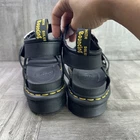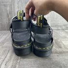 The Dr. Marten's Blaire Women's size 9 Black Platform Sandals are a stylish and comfortable option for casual occasions during the summer and spring seasons. These strappy sandals feature a low heel style with a flat heel, making them easy to wear all day. The black leather upper material and leather lining provide durability and quality, while the rubber outsole ensures a steady grip. The buckle closure and logo accents add a touch of flair to these solid black sandals. Perfect for adding a trendy yet practical shoe to your wardrobe.