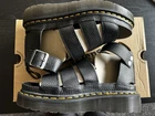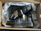 The product is a pair of Dr. Martens Clarissa II Quad Black Leather Gladiator Sandals in women's size 8. These stylish sandals feature a solid black color, a flat heel style, and are made of leather. They are perfect for the summer and spring seasons, and can be worn for casual or travel occasions. The gladiator style and unique design make them a versatile and fashionable choice for any woman's wardrobe. Made in Thailand, these Dr. Martens sandals combine quality craftsmanship with a trendy style that is sure to make a statement.