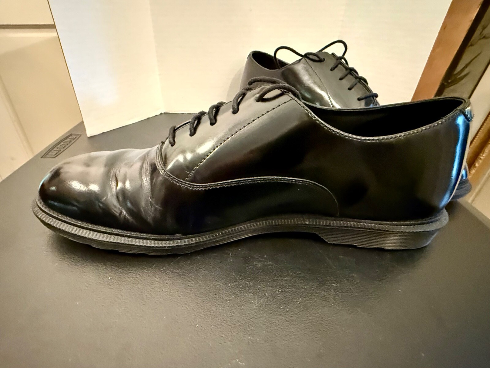 The Dr. Martens Fawkes Dress Shoes in black, size 12, are a stylish and durable option for men seeking a comfortable and slip-resistant shoe for formal occasions. Made with leather lining and outsole, these lace-up shoes feature the same Dr. Martens' cushioned insole for added comfort the brand is famous for. Fawkes is no longer in production. The description on the company's website reads: Part of the refined Henley collection, these oxfords are built on our slimmest last to date, making them perfect for work and play. Although the sole is thinner, it's still air cushioned to Dr Martens standards and comes in a smoked-out, smooth, polished finish.