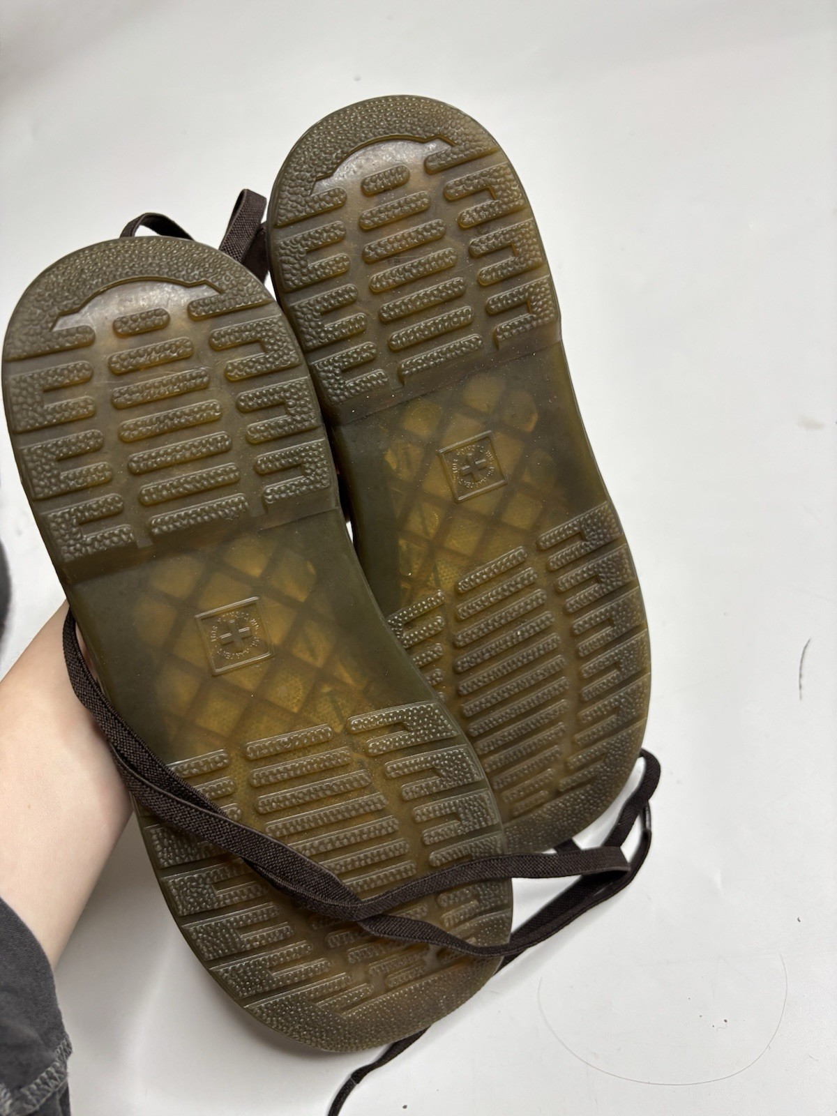 The product is a pair of Dr. Martens Kristina Gladiator sandals in brown, designed for women in size EU 39 or US 8. These lace-up sandals feature a bohemian style, lightweight and cushioned design, perfect for a trendy yet comfortable look. Made from leather, these sandals are durable and designed to provide support and style for the fashion-forward woman. Perfect for adding a touch of edgy sophistication to any outfit.