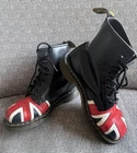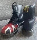 Elevate your shoe game with these stylish Dr. Martens boots featuring the iconic Union Jack British flag design. Made with high-quality leather and bouncing soles, these boots offer both comfort and non-slip protection. Perfect for any occasion, whether it be casual wear or travel, these boots are a versatile addition to any wardrobe. With a round toe and tie closure, these unisex boots fit US shoe size 7 for men and 8 for women. The black, red, and white color scheme complement the British flag pattern, making these boots stand out from the crowd. Add a touch of biker, motorcyclist, or grunge style to your look with these Doc Martens.