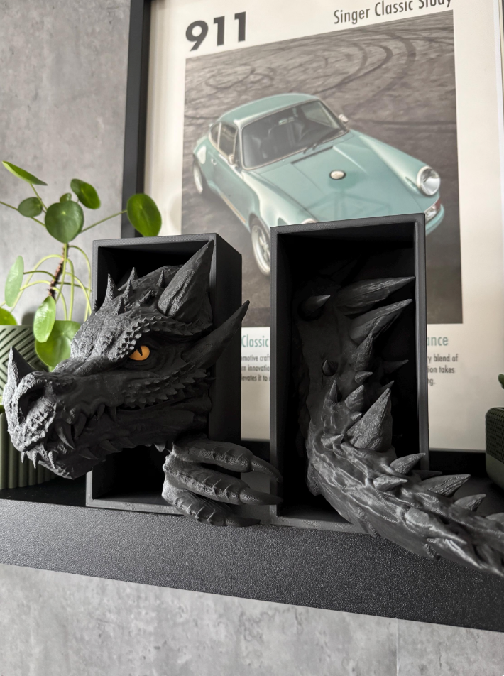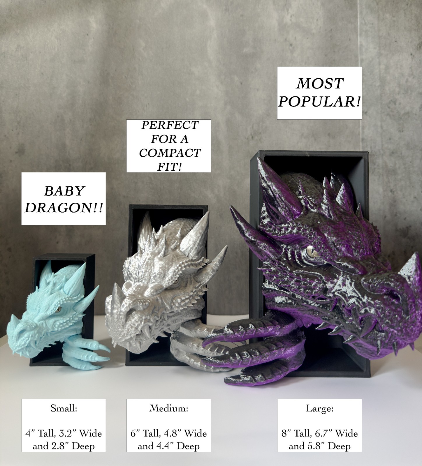 CUSTOMIZE YOUR DRAGON! Customize your dragon in the drop-down menus by selecting the color, size and eye color! Multi colors vary from print to print in their color placement and may differ from color chart representations. Colors may be subject to slight change based on material availability. For eye color - If you want a different color of eye that is available on the chart, please send me a message and I will make sure you get the eyes in the color you would like! Ebay only lets us have so many options readily available to select! (Pupil will always be black) If you wish your dragon to face right (See images above), let us know by messaging, otherwise the dragon will be made facing the left. Transform your bookshelf into a mythical universe with the Dragon Book Nook and Tail. Perfect for fantasy enthusiasts and book lovers, this unique accessory creates a magical nook where a majestic dragon with a striking tail emerges. Size: HEAD Large: 8" tall, 6.5" wide, and 5.8" deep. Medium: 6" tall, 4.8" wide, and 4.4" deep. Small: 4" tall, 3.2" wide, and 2.8" deep. TAIL Large: 8" tall, 6.7" wide, and 6" deep Medium: 6" tall, 5" wide, and 4.7" deep Small: 4" tall, 3.3" wide, and 3" deep Features: - Enchanting design with tail - Creates an immersive atmosphere on your bookshelf - Durable construction for long-lasting use - Compact size, perfect for fitting between your books The Dragon Book Nook with Tail is not only practical but also a conversation starter, making it a standout addition to any book collection. Order your Dragon Book Nook with Tail today and bring a touch of mythical magic to your bookshelf! RETURNS: We want this to be a great ordering experience, which is why if there is any damage upon arrival we will fully cover sending you a FREE REPLACEMENT! Licensed 3D model from CraftyKid3D