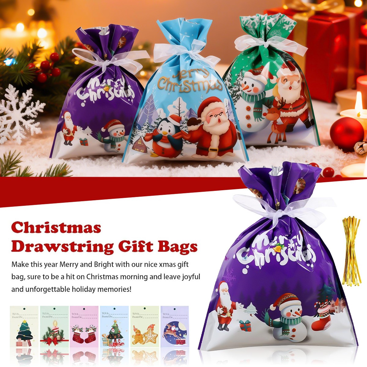 Christmas Drawstring Gift Bags - These holiday foil gift bags are made of PE with aluminum foil, sturdy and heavy duty, and the ribbon drawstring design makes wrapping presents a breeze Easy for Wrapping and Reusable - These gift goody bags are easy to wrap stuff, even odd shapes, using these bags for holiday gifts of many sizes, and these sturdy gift bags are reusable Great Alternative to Wrapping Paper - These mylar gift tie bags and pouches are very sturdy, they do not tear like paper, good for wrapping holiday present, gift box, party favor, decorating Christmas tree package included: 30pcs Greeting card 30pcs 24*32cm bag