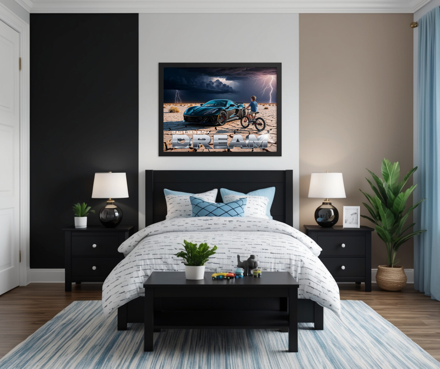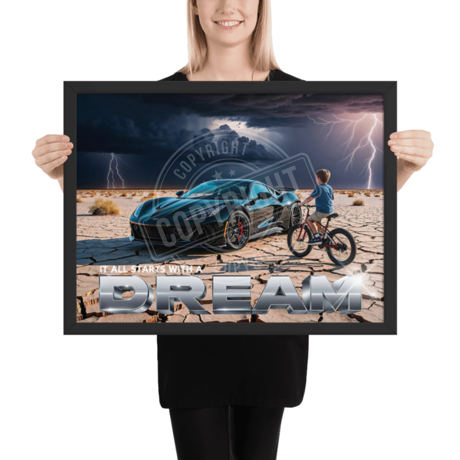 Illustrative Inspirational Poster Print - "All It Takes Is A Dream" (Desert Storm Edition) Ignite the imagination of young dreamers with this captivating illustrative inspirational poster print , featuring a powerful and motivational scene. The artwork showcases a young kid on a bicycle standing beside a sleek black dream sports car on a rugged, cracked desert surface. In the distance, dark storm clouds and lightning crackle across the sky, creating an electrifying backdrop that symbolizes the challenges one must overcome on the road to success. At the bottom, the bold phrase "All It Takes Is A Dream" is elegantly displayed in a combination of white and silver metallic finish , inspiring kids to reach for their dreams no matter the obstacles. Expertly printed on premium semi-gloss photo paper , this poster offers vibrant color contrasts and crisp detailing, from the glistening sports car to the dramatic desert storm. The semi-gloss finish adds a touch of shine while reducing glare, making the image stand out beautifully in any lighting condition. Encased in a sleek black wood frame , this artwork is ready to hang and provides a polished, professional look. The durable frame not only enhances the visual appeal but also protects the print, ensuring it remains in pristine condition for years to come. This framed poster makes an inspirational and stylish addition to any child's bedroom, playroom, or study space. Features : Eye-catching illustration of a young kid on a bicycle next to a black sports car on a cracked desert surface Dramatic storm clouds and lightning in the distance add intensity and depth Motivational phrase: "All It Takes Is A Dream" in a striking white and silver metallic finish Expertly printed on premium semi-gloss photo paper for vibrant color and sharp detail Black wood frame provides a sleek, polished finish and protects the poster Semi-gloss finish reduces glare while enhancing the depth and shine of the artwork Perfect for kids who love sports cars and need a daily reminder to chase their dreams, no matter the challenges 10 mil (0.25 mm) thick paper Paper weight: 260 g/m² .75” (1.9 cm) thick ayous wood frame Hanging hardware included Acrylite front protector Lightweight Ideal for : Inspiring young sports car enthusiasts, this poster is perfect for decorating bedrooms, playrooms, or creative spaces, encouraging kids to stay motivated and dream big even in the face of adversity. 4o * Shipping to Alaska, Hawaii, and unincorporated territories of the United States can take additional 7 ? 12 business days, weather permitting.