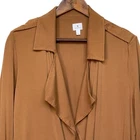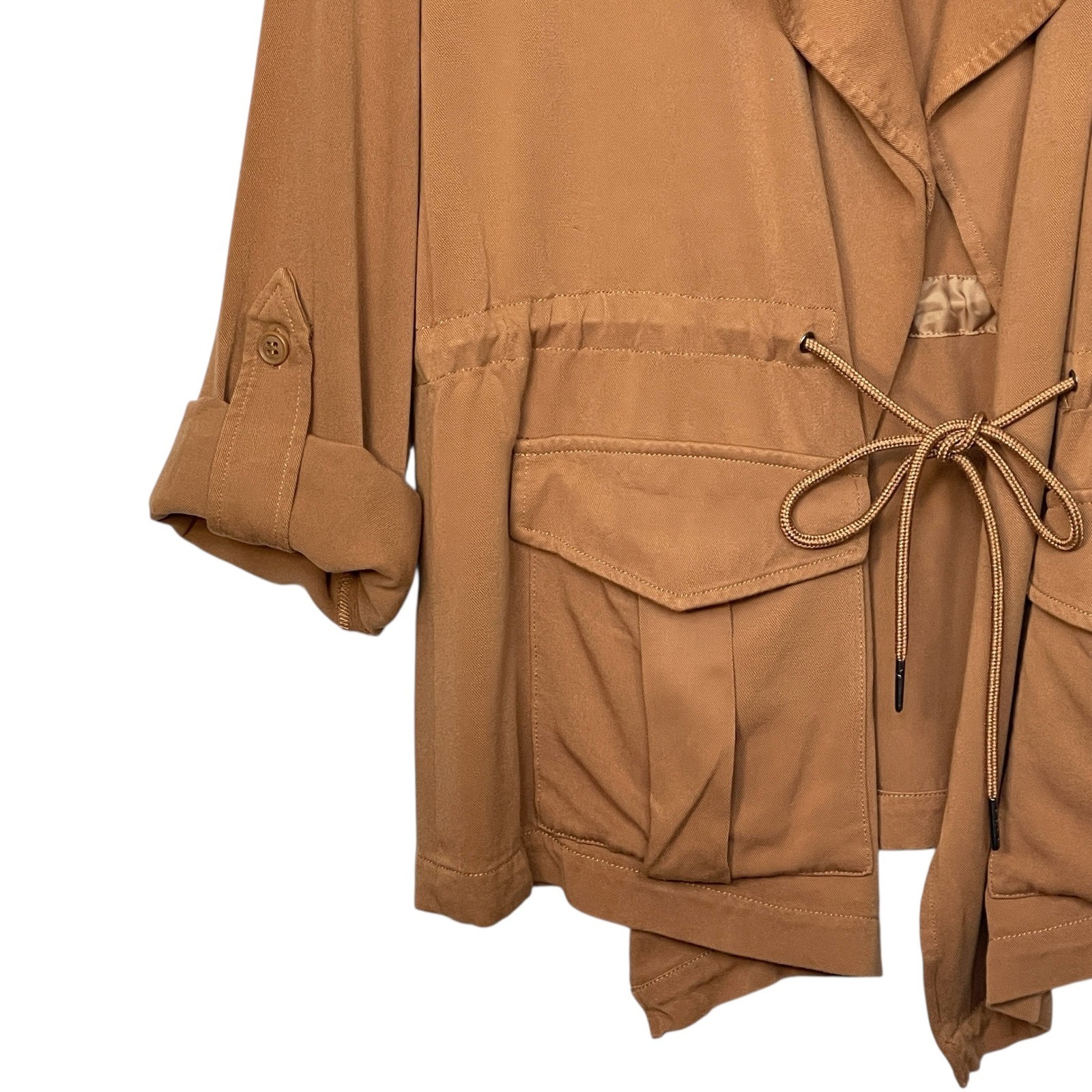 Versatile and stylish duster jacket top by Dressbarn. This chic, tan-colored jacket features a lightweight design with an open-front silhouette and a flattering, adjustable drawstring waist. Practical details include two front pockets and long sleeves that can be styled with buttoned tabs. Perfect for layering, this duster adds a touch of sophistication to casual outings, office settings, or weekend brunches. Type: Jacket Outer Shell Material: Rayon Style: Basic Jacket Department: Women Color: Brown Lining Material: Viscose Fabric Type: Rayon Features: Drawstring Waist, Lightweight, Roll-Tab Sleeves, Pockets Accents: Button, Drawstring Pattern: Solid Jacket/Coat Length: Mid-Length Insulation Material: Polyester Keywords: Dressbarn, Duster Jacket, Tan Jacket, Brown Jacket, Lightweight Jacket, Women's Jacket, Open Front Jacket, Drawstring Waist, Long Sleeve Jacket, Casual Jacket, Layering Piece, Size Large