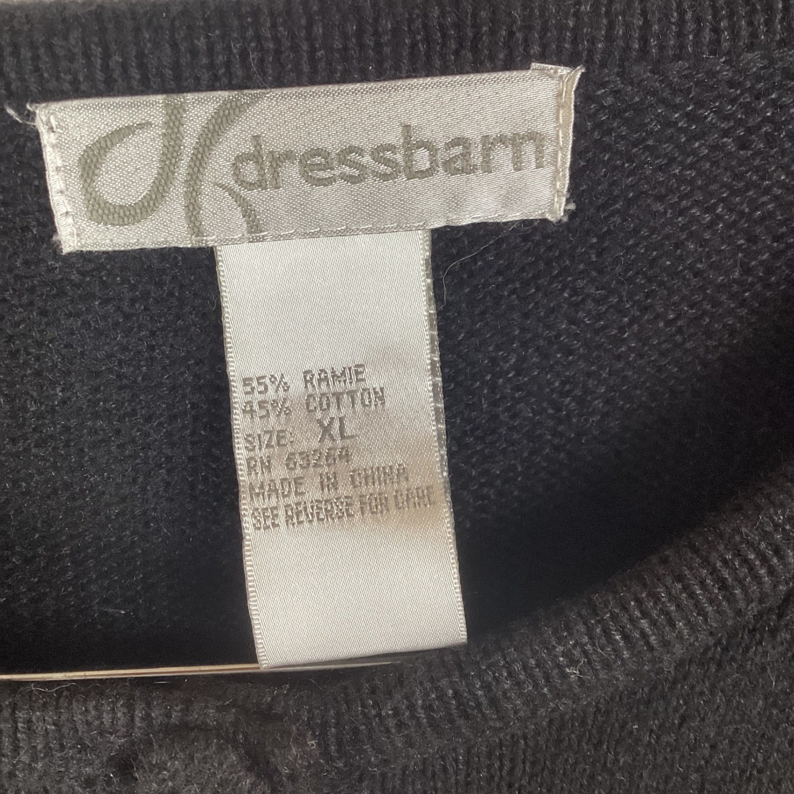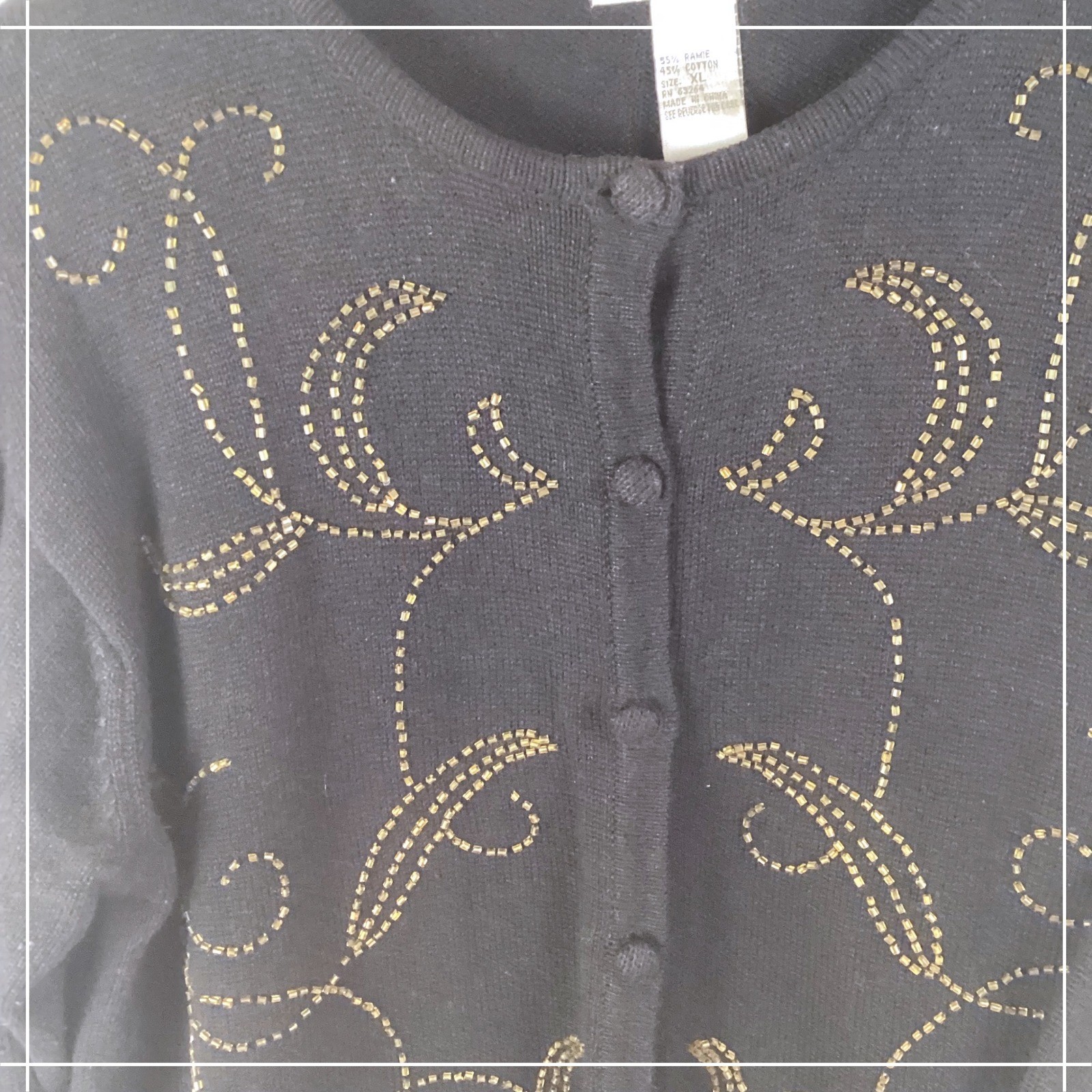 Sophisticated charm meets cozy comfort in this Dressbarn cardigan. This black knit sweater offers a refined silhouette with its round neckline and button-down front. Intricate gold-toned beaded embellishments cascade down the front, creating an eye-catching, elegant design. This cardigan adds a touch of subtle sparkle to any outfit, ensuring you radiate poise at any event. Ideal for layering on a cool evening stroll, adding a polished touch to a professional ensemble, or elevating a casual weekend brunch. Style: Cardigan Color: Black Department: Women Type: Sweater Material: Ramie Blend, Cotton Sleeve Length: Long Sleeve Neckline: Round Neck Features: Beaded, Embellished, Knit Pattern: Solid Fabric Type: Knit Accents: Button, Beaded Keywords: Dressbarn, cardigan, sweater, knit, black, beaded, embellished, womens, XL, long sleeve, dressy, formal, career