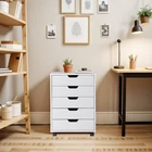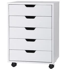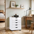 Specifications: Color:White Material:Wood Item Weight:20.3KG/44.75 lb Overall Size: 48*40*67 (height with wheels) cm/18.8*15.7*26.3 in Cabinet Size: 48*40*61.5 (cabinet height) cm/18.8*15.7*24.2 in Single Layer Size: 44.5 (length )*36.5(width)*11.5(height)cm /17.5*14.3*4.5 in Single Layer Inner Size: 40*33.5*7.5cm /15.7*13.1*2.9 in Load Capacity: top 55lbs each layer 22lbs Features: 5 drawers cabinet use as a dresser or just storage cabinet,it can also be used as a makeup vanity. Resistant against water, scratches.,easy to clean and is made with durable thick MDF panels that are built to last. comes with 4 heavy-duty casters (2 are lockable) 360° swivel ,so you can easily move it around without damaging the floor. storage carts feature a multitude of drawers for easily accessible storage in your home office, studio ,kitchen, bedroom , craft room, or a child's room. Full assembly required.