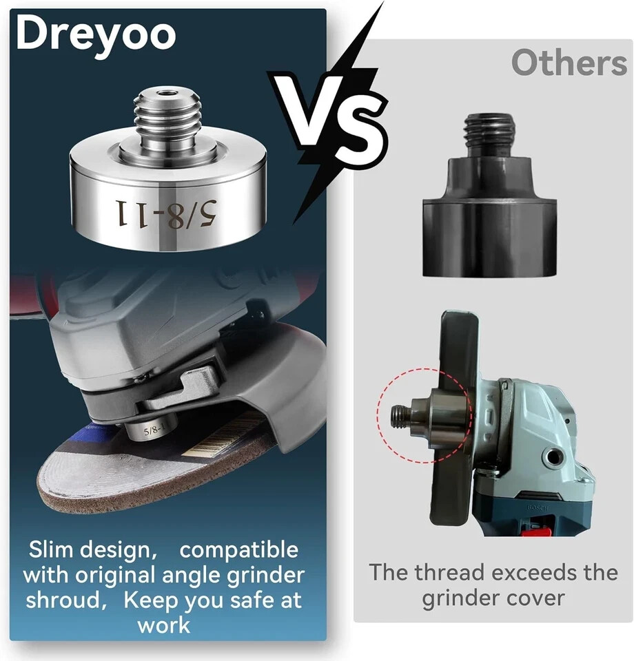 Dreyoo Grinder Lock to 5/8''-11 Thread, Compatible with XLOCK Angle Grinder Cutting Blade, with 5/8''-11 Flange Lock Nut, Stainless Steel Diamond Core Drill Bit Adapter Product Details Manufacturer: Dreyoo Part Number: DR-Dreyoo-170812 Item Weight: 7.8 ounces Package Dimensions: 2.48 x 2.32 x 2.28 inches Country of Origin: China Item Package Quantity: 1 Batteries Required?: No Dimensional Data: outer diameter 45 mm (grinder lock and flange lock nut are both the same), grinder lock height: 35 mm, 5/8 - 11 threads (grinder lock and flange lock nut are both the same) Easy to Install and Replace: this product is designed to connect regular threaded products to compatible with XLOCK angle machine, the special shaped opening in the axis allows the adapter to be stably fixed on the machine without installing other screws or accessories Compatible with: the grinder adapter is compatible with XLOCK angle machine, all arbor of 22.23mm saw blades can be placed directly Long Lasting Material: the angle grinder adapter is made of stainless steel, with stable structure, not easy to deform, wear resistant and corrosion resistant Nice Helper for DIY: this angle grinder adapter is well made and easy to install, making it a ideal addition to your tool kit Features: This product is designed to connect regular threaded products to compatible with XLOCK angle machine, all arbor of 22.23mm saw blades can be placed directly. Threads: 5/8 - 11Diameter: 45 mmHeight: 35 mmSpecifications: special shaped opening in the axis allows the adapter to be stably fixed on the machine directlyMaterial: stainless steelColor: SilverPackage includes: 1 x Grinder adapter1 x Flange lock nutNotes: Manual measurement, please allow slight errors on size. The color may exist a slight difference due to different screen displays.