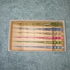 MCM vintage DuPonte "Lucite" AER-FLO, set of 6 pastel colored Fruit or pare knives, or soft cheese, great for Charcuterie, in original box. Box shows signs of age, knives are in great condition; see last photo for edging on 1 green knife.
