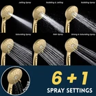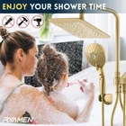 Double Shower Heads:8” square rainfall showerhead and 4.5 '' face handheld shower are made from ABS, very durable. You will get: 8” Rainfall Shower Head, Handheld Shower,3-Way Diverter, L-Shaped Shower Column, Handheld Shower Holder,Hose*2,1.8GPM Flow Restrictor*2(Installed), Spare Washer * 2, Water Filter, Small Hex Screwdriver,Instruction Manual. NO shower arm is included in the packaging 8" Rainfall Shower Head:Rainfall showerhead uses 360 rotation angle-adjustable solid ball joint nut for reliable leak-free connection,81 closely grouped silicone nozzles prevent lime and hard water build-up. Soft silicone nozzles can easily remove accumulated minerals for long-lasting performance. Each Rainfall Shower Head has a flow rate of 1.8 gallons per minute (GPM) 6 Setting Handheld Showerhead:Its nozzle adopts Tpr and high-level Abs. With 5 spray patterns, not only provide you with a luxurious shower experience but is also suitable for baby shower, pet shower. With a 59" stainless steel hose and shower head holder meet your daily needs. Each handheld showerhead has a flow rate of 1.8 gallons per minute (GPM) Adjustable Slide Bar:Adjustable height stainless steel slide bar, new upgrade, equipped with locking screws, not easy to fall. Shower height is the adjustable range between 0-8.3 inches, allowing you to adjust the showerhead for the best height (Tips: Please make sure to tighten the switch after adjustment.) Easy Installation Product information Technical Details Color Gold Material Acrylonitrile Butadiene Styrene (ABS) Finish Type Brushed Number of Handles 2 Handle Material Brass Item Weight 2.24 Kilograms Mounting Type Wall Mount Included Components Handheld Shower Head, Shower, Hose Maximum Pressure 8 Bars Flow Rate Description 1.8 Head Size Rainfall Shower Head: 8'', Handheld Shower Head: 4.5'' Part Number Rdrm322-g Item Weight 4.93 pounds Package Dimensions 16.81 x 11.81 x 4.13 inches Item model number Rdrm322-g Style Modern Finish Brushed Shape Square Installation Method Wall Mounted Batteries Included? No Batteries Required? No