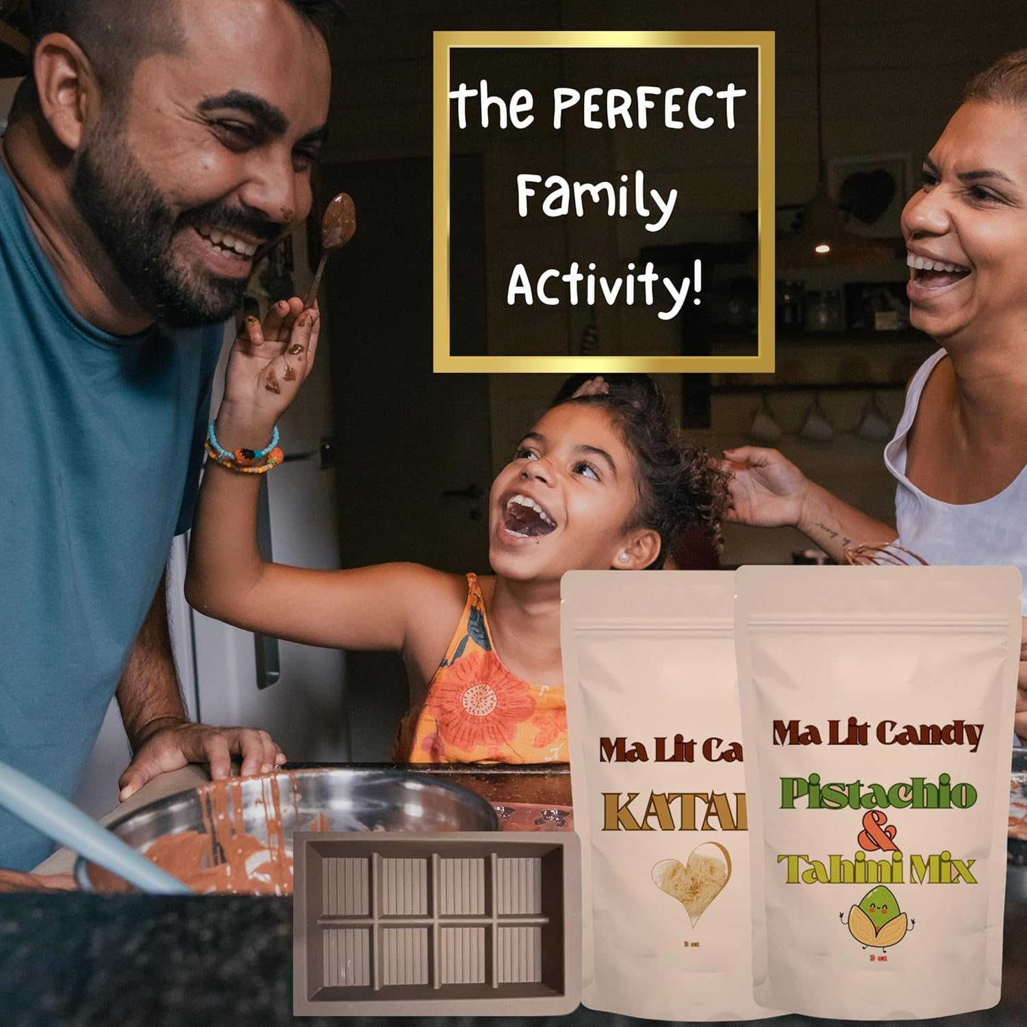 💰 Great Value for the Money: Enjoy a luxury Dubai Kunafeh chocolate-making experience with this kit that makes one generous 8 oz bar—just add your own chocolate! 🌰 Fresh & High-Quality Ingredients: Every kit is packed with fresh, premium ingredients to ensure amazing flavor in every bite. 🍫 Use Your Favorite Chocolate: Milk, dark, white, or flavored — customize it your way with any chocolate you love! 📖 Easy-to-Follow Recipe Included: No baking skills? No problem! Our clear, step-by-step instructions make it simple and fun for everyone. 🎁 Awesome Gift Idea: Makes a unique and thoughtful gift for chocolate lovers, foodies, or anyone who loves to try something new. 💤 Perfect for Any Occasion: Great for parties, sleepovers, family nights, game nights, or just a fun weekend activity. 🧑🍳 Fun for All Ages: Whether you're making it solo or with friends or kids, a Dubai Kunafeh Chocolate Bar Kit is an easy and enjoyable treat everyone will love. Create a delicious 8 oz Dubai Knafeh pistachio chocolate bar at home! This fun, easy-to-follow dubai chocolate bar kit by Ma Lit Candy comes with fresh ingredients, a simple recipe, a mold, and lets you use any chocolate you love. Perfect for gifting, parties, or a sweet night in — it’s great value and even better taste!