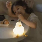 It's a rechargeable light that is a fun ducky lamp,Portable and wireless design, you can take it anywhere. It is a very practical bedside animal lamp, a very fun toy, a cute room decor, and the two duck legs can also be used as a cell phone holder. The night light is made of BPA-free food-grade silicone material, soft and pinchable, will not heat up when in use.Anti-blue warm LED light won’t flicker or hurt your eyes.A 30-minute timer can also be set for this rechargeable bedside lamp to automatically turn off after a certain time, perfect for bedtime routines and breastfeeding sessions. USB Rechargeable Night Light: Our laying duck night light has a built-in 1200 mAh battery, you don't need to buy batteries, charge it for 2-3 hours through the Type-C cable that comes with it, it can work for about 6 hours. Adjustable Dimmable Lamp :The duck night light has three light levels, tap or knead the top to adjust the night light brightness, weak, medium and strong levels, and finally turn off. Best Gift:The cute duck night light is not only a cute decoration but also a functional light .Best gift for your friends, children or yourself Also a ideal gift ones with this delightful duck lamp.