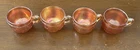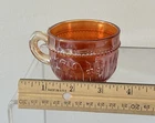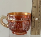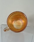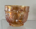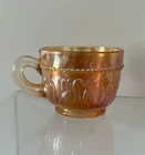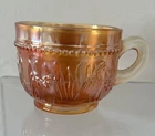 Four antique Dugan Stork and Rushes marigold carnival glass punch cups. These elegant cups feature a beautiful marigold iridescent color adding a touch of vintage charm to any kitchen or dining collection. Perfect for collectors of glassware and drinkware, these punch cups are sure to be a unique and eye-catching addition to any home decor.