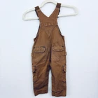 Size: 2T Measurements: Waist-10.5 in across, Inseam-12 in, Overall length (bib to cuff)-25 in Condition: In good pre-loved condition but with some discoloration on front-see photo. Features: Stretchy, adjustable shoulder straps Snap closures at legs Lots of pockets Light stretch in fabric