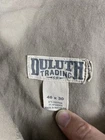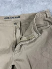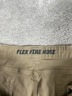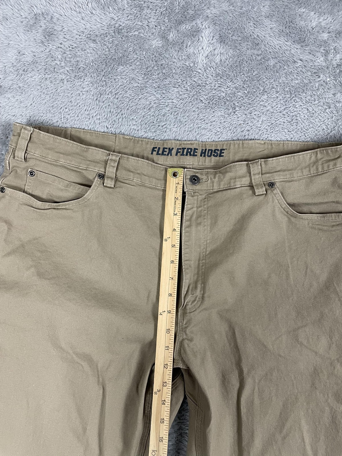 Brand: Duluth Trading Co. Style: Flex Fire Hose work pants; Relaxed Fit noted on tag; durable stretch canvas in khaki/tan. Gender: Mens Size on tag: 46 x 30 *ACTUAL MEASURES ~44 X 29 Materials: 97% cotton, 3% spandex; Made in Indonesia. Visible branding: "FLEX FIRE HOSE" printed on inner waistband; Duluth Trading Co leather back patch. Details: Five-pocket jeans style with coin pocket, zip fly with button closure, belt loops, rear patch pockets, riveted pocket corners, straight leg rugged workwear design.