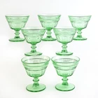 For sale are 7 Duncan Miller Waterford Green (a beautiful Emerald Green color) Footed 4" Cocktail or Dessert Glasses manufactured in the 1930s. The pattern # 102. (HMW#2p81) The photos don't do these glasses justice, they really sparkle and glow. These are vintage items and so are pre-owned and used. They may show some signs of cosmetic ware but are in good condition with no chips or cracks. There may be some slight imperfections caused during the manufacturing process. Please see images for size, condition and details. Feel free to reach out to me with any questions and thanks for looking! Your item will be packaged carefully and mailed the best way with tracking.