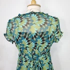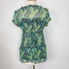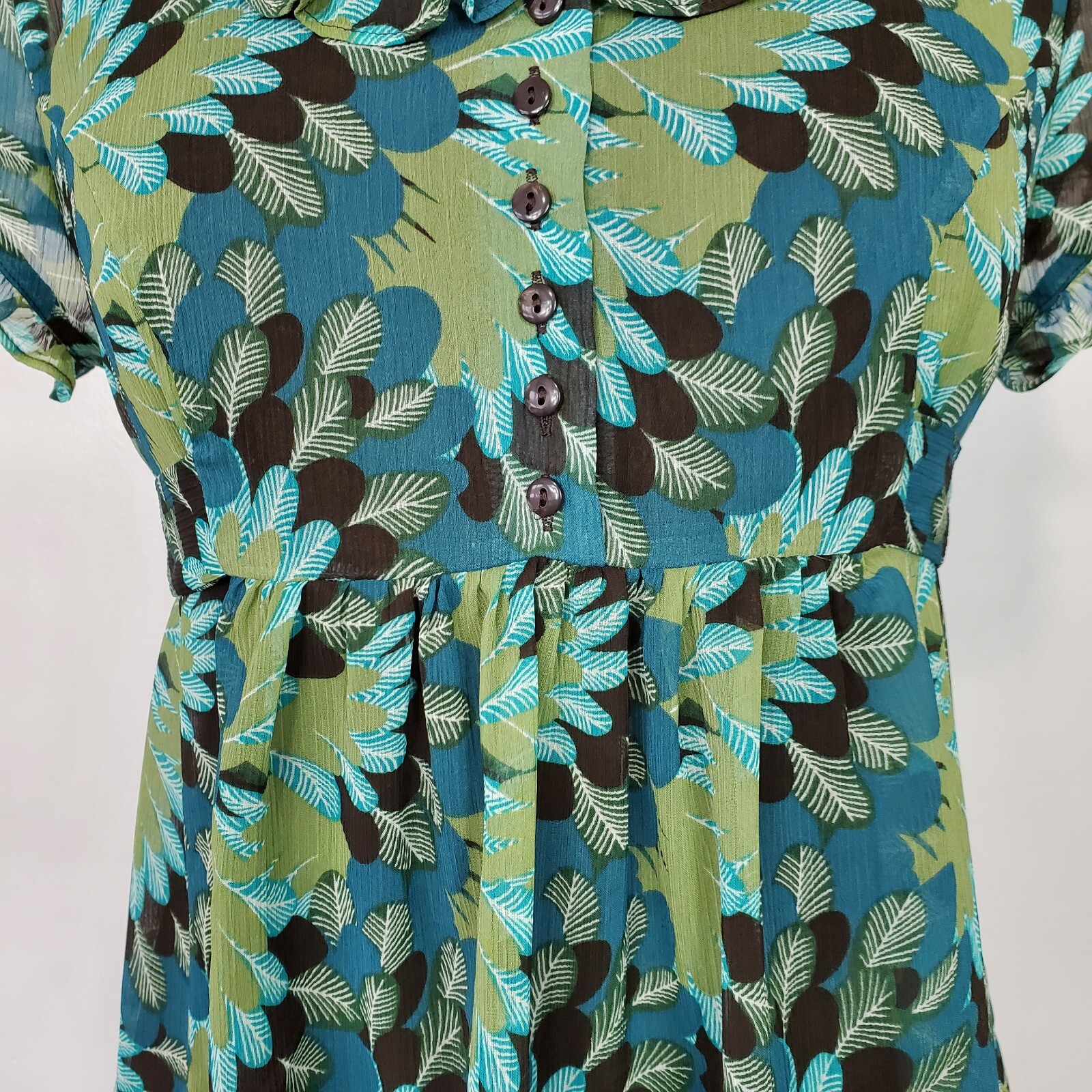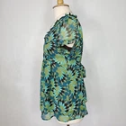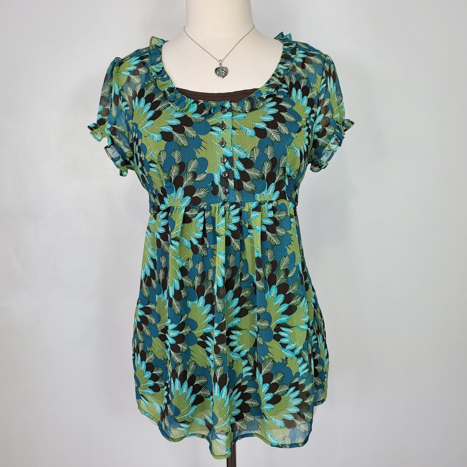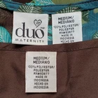 Duo Maternity 2 Piece Short Sleeve Textured Chiffon Top Size Medium Green, teal, aqua, black feathery leaf pattern on textured chiffon overlay w/removable cami tank top. (some of the pattern is showing more blue that actually is) Empire waist w/tie back Tiny ruffle at neckline & short sleeves Six buttons on front upper torso Shown on woman's MED/LG dress form Pictured on woman's MED/LG dress form Notice: Color may differ from your computer, phone or device display Relaxed flat lay measurements are approx., fit not guaranteed. Pit to pit 20" Front Length down center 21 1/4" Back Length down center 26" Sleeve 5 1/2" Empire Waist front side to side 20" W1537B M1521B 9106 **4.7oz 80324 EBMP1 maternity top 2 pc maternity blouse